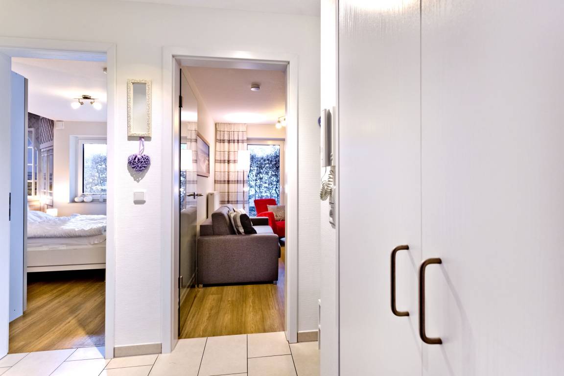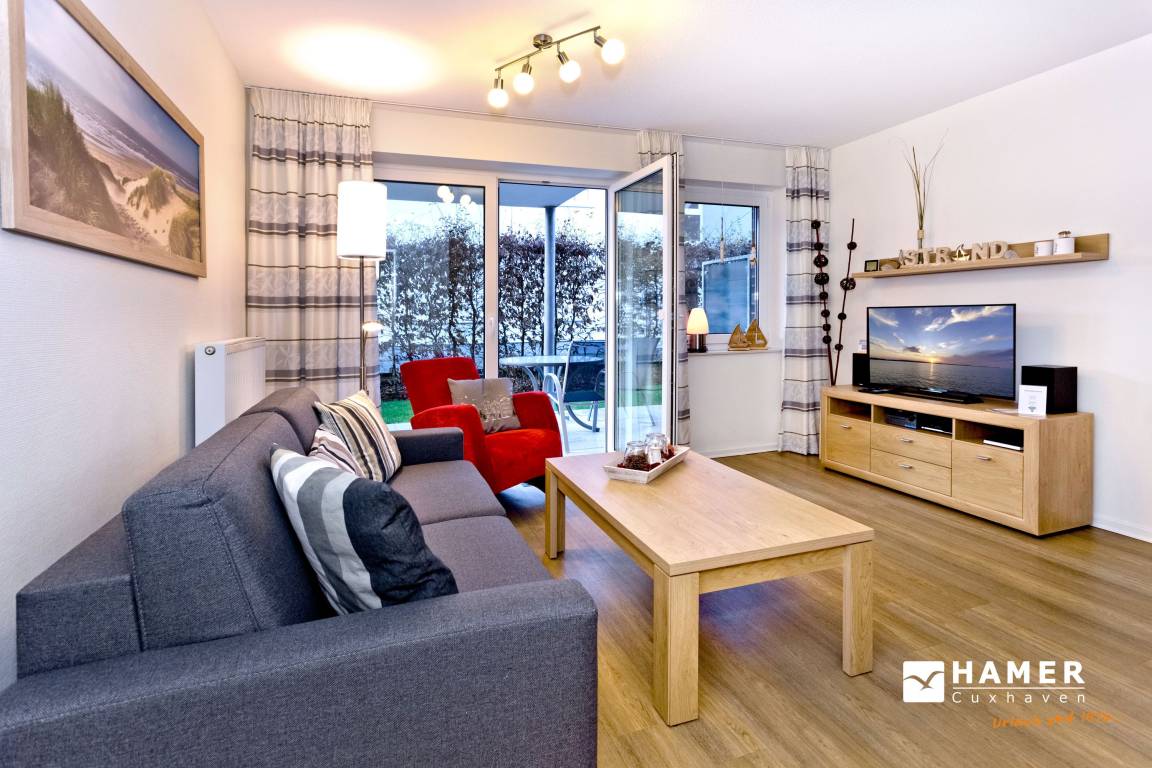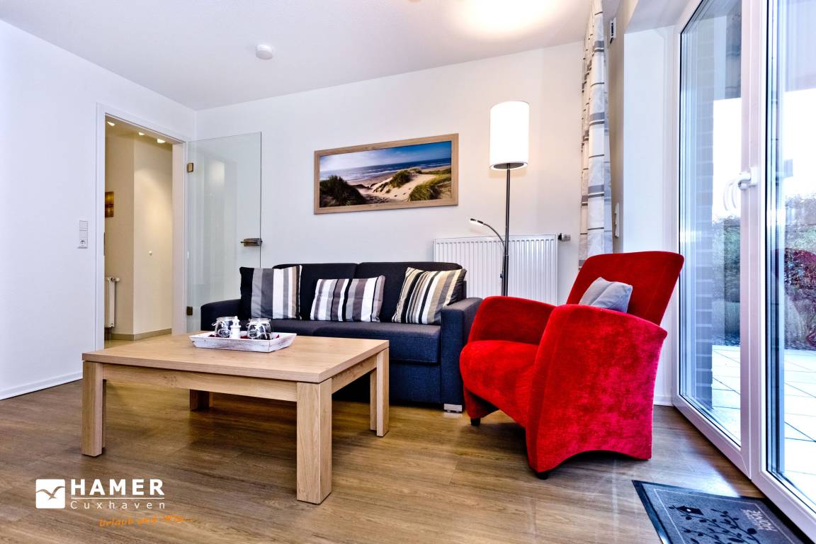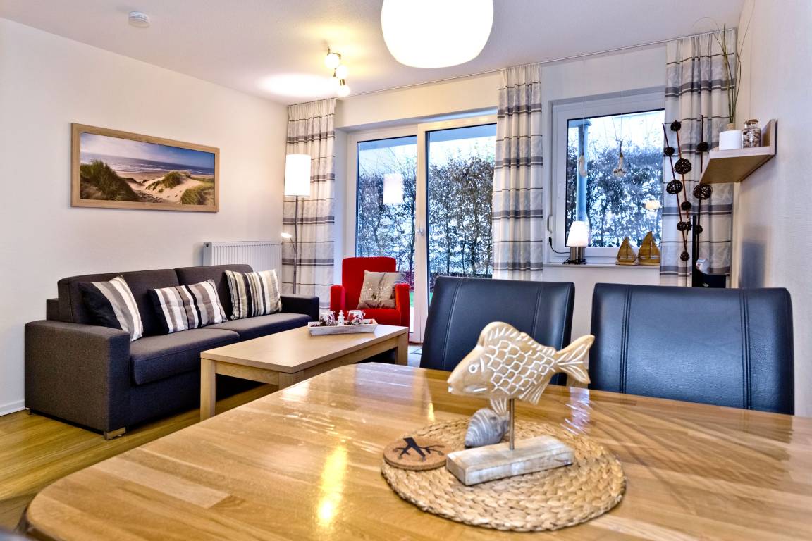 Geschmackvoll und vollständig ausgestattete Wohnung auf ca. 46m² bis 4 Pers., parterre mit großer Terrasse und Rasenanteil (süd), 1 Schlafzimmer mit Doppelbett, Wohn-/Schlafzimmer mit Schlafcouch, 2x SAT-TV,DVD,CD, W-LAN kostenlos., vollständige Küchenzeile mit Geschirrspüler, Mikrowelle, Backofen, Gefrierfach, ebenerdige Dusche/Wc, Föhn, alle Räume mit Rollladen, Nichtraucher, Pkw-Stellplatz #11, keine Haustiere gestattet.