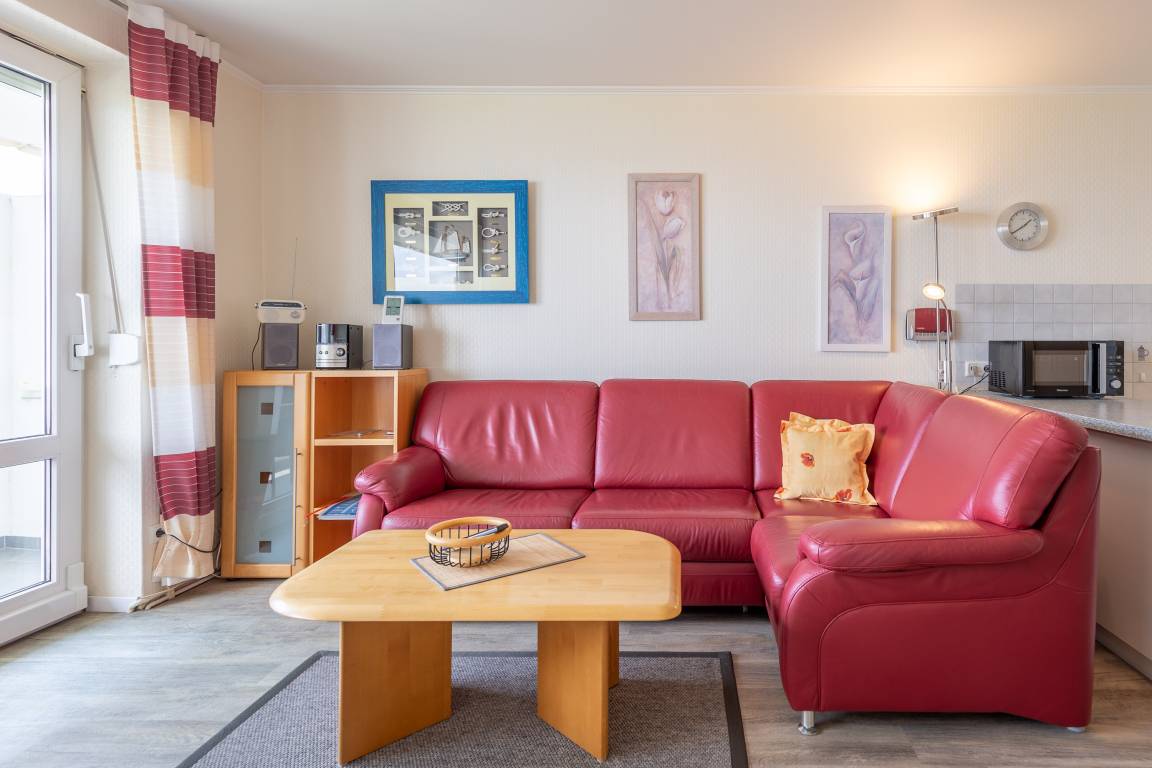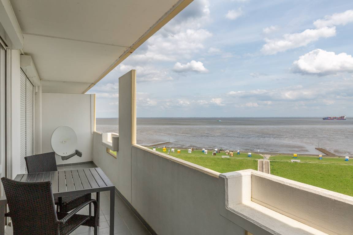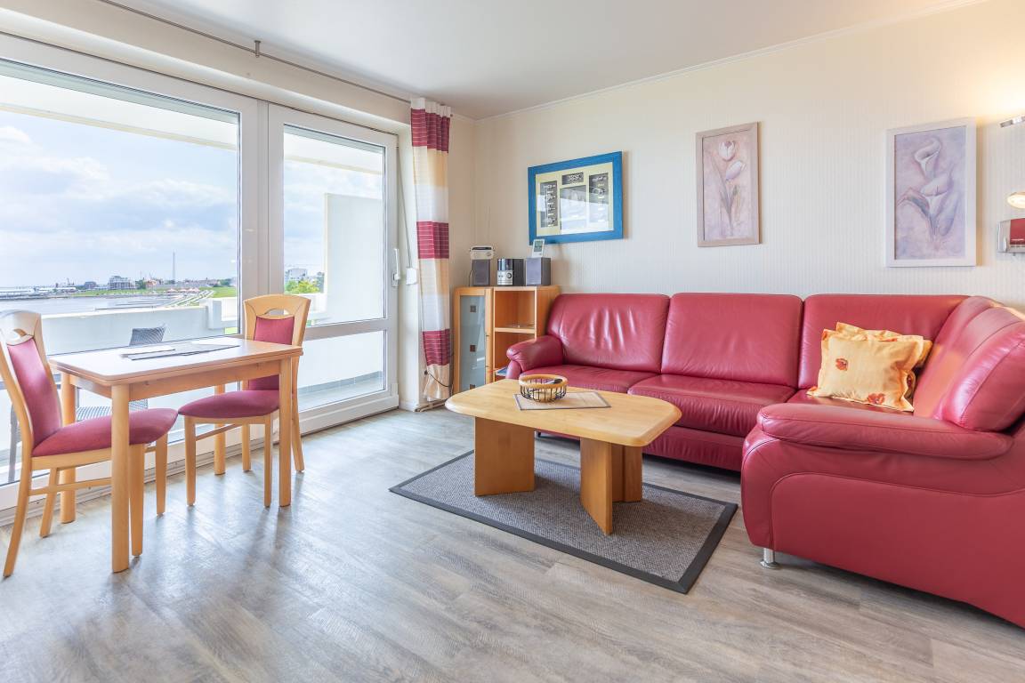 Im kombinierten Wohn- und Essbereich ist eine funktionale Küchenzeile mit Kühlschrank, Gefrierfach, Geschirrspüler und Mikrowelle integriert. Dank Flachbildfernseher müssen Sie auch im Urlaub nicht auf einen entspannten Fernsehabend verzichten. Der Balkon ist eine wahre Freiluft-Nordseeloge und erstreckt sich über die gesamte Fläche des Wohn- und Schlafzimmers. Selbstverständlich genießen Sie auch vom Balkon den traumhaften Meerblick.