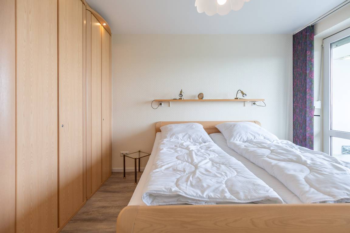 Die 2-Zimmer Ferienwohnung bietet 2 Personen auf 55 m² genügend Raum für behagliches und erholsames Wohnen. Auch das separate Schlafzimmer bietet Meerblick und einen direkten Zugang zum Balkon. Das komfortable Doppelbett und Außenjalousien gewährleistet, dass Sie sich auch im Schlaf erholen.