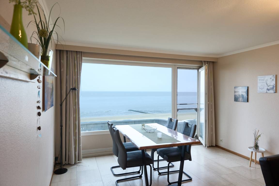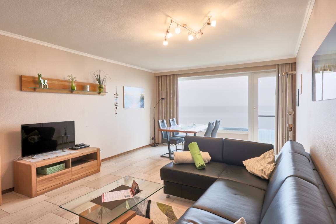 Der großzügige Wohn- und Essbereich verfügt über ein beeindruckendes Panoramafenster - ohne Balkon, dafür mit einem Strandkorb am Strand in den Monaten Mai bis September - und lädt mit einem Essbereich und einem angrenzenden Ecksofa zum Verweilen ein. Damit Sie in den Monaten Mai bis September dennoch die frische Luft genießen können, steht Ihnen direkt am Duhner Strand ein kostenfrei zu nutzender Strandkorb zur Verfügung.