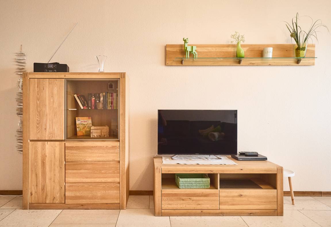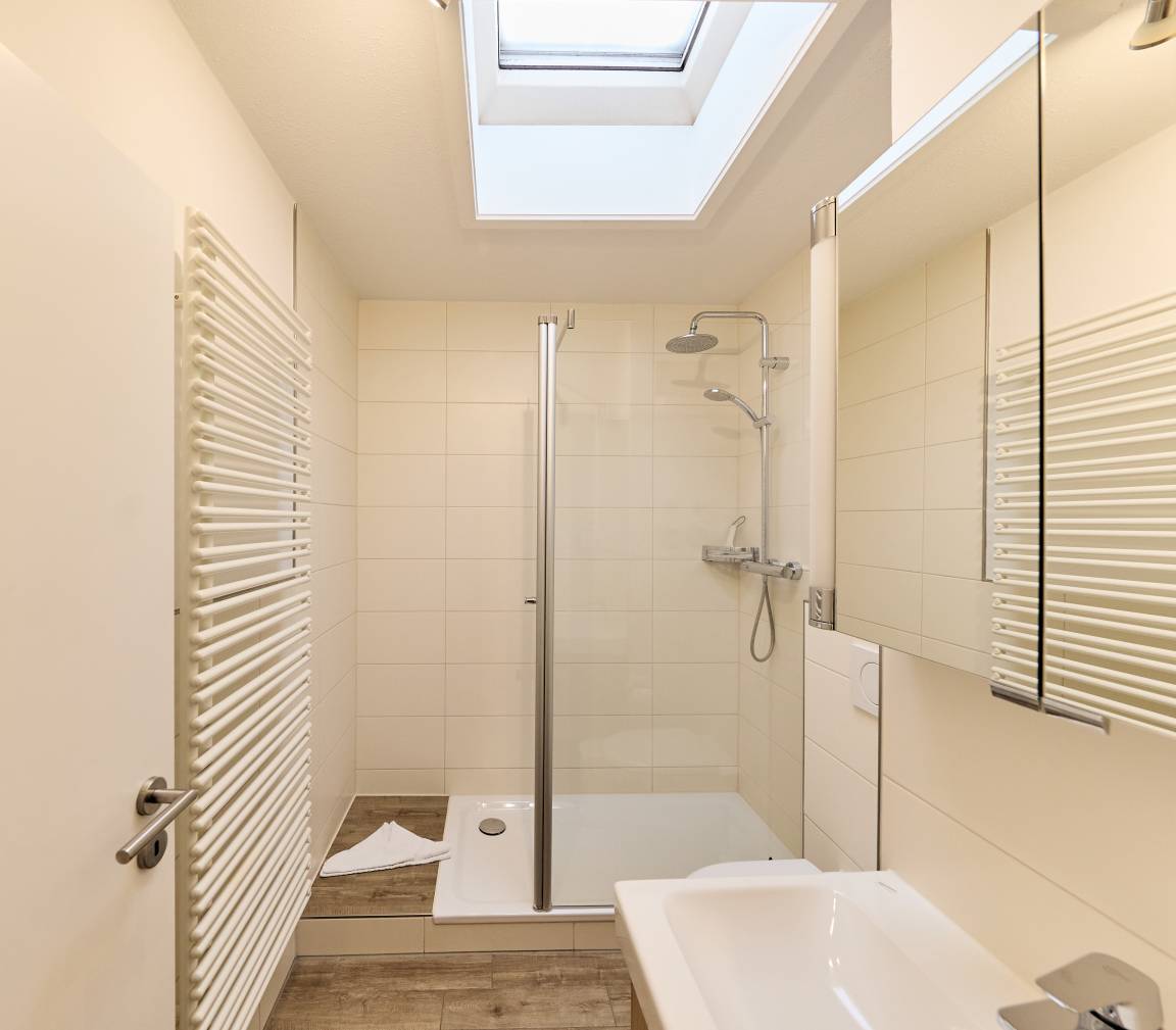 Die Wohnung ist außerdem mit einem modernen Duschbad mit WC (große ebenerdige Dusche), einem Flur mit Garderobe und einem Schlafzimmer, Doppelbett mit Kleiderschrank ausgestattet. Die separate und moderne Küche bietet Geschirrspüler, Herd mit Abzug, einen Backofen, ein Kühlschrank mit Gefrierfach, sowie einen klappbaren Stehtresen für die Essenszubereitung.