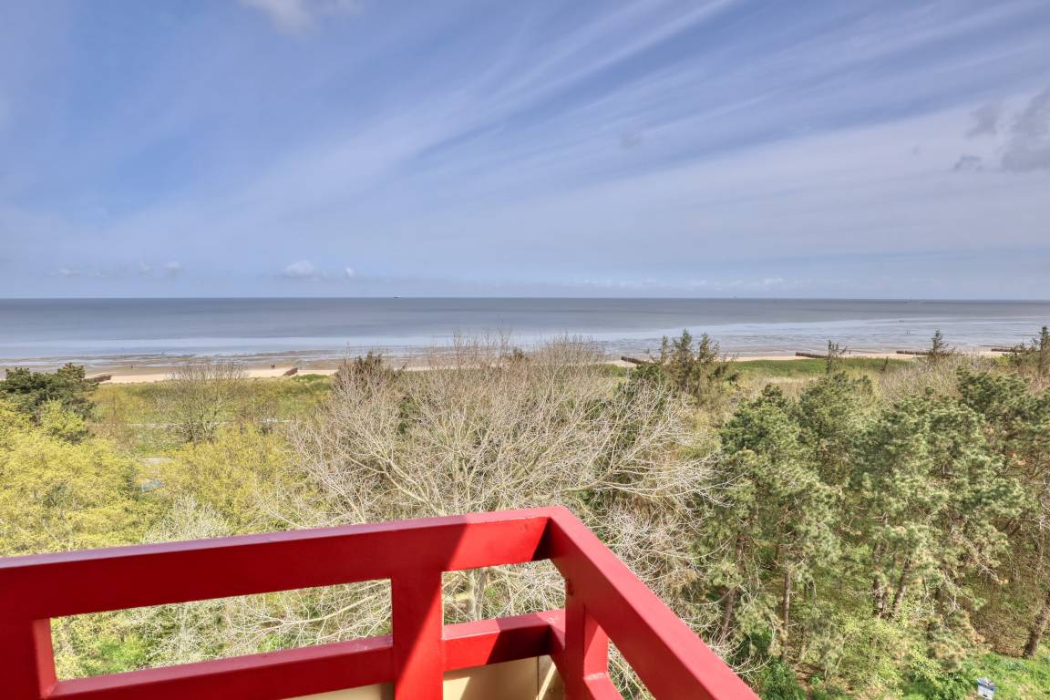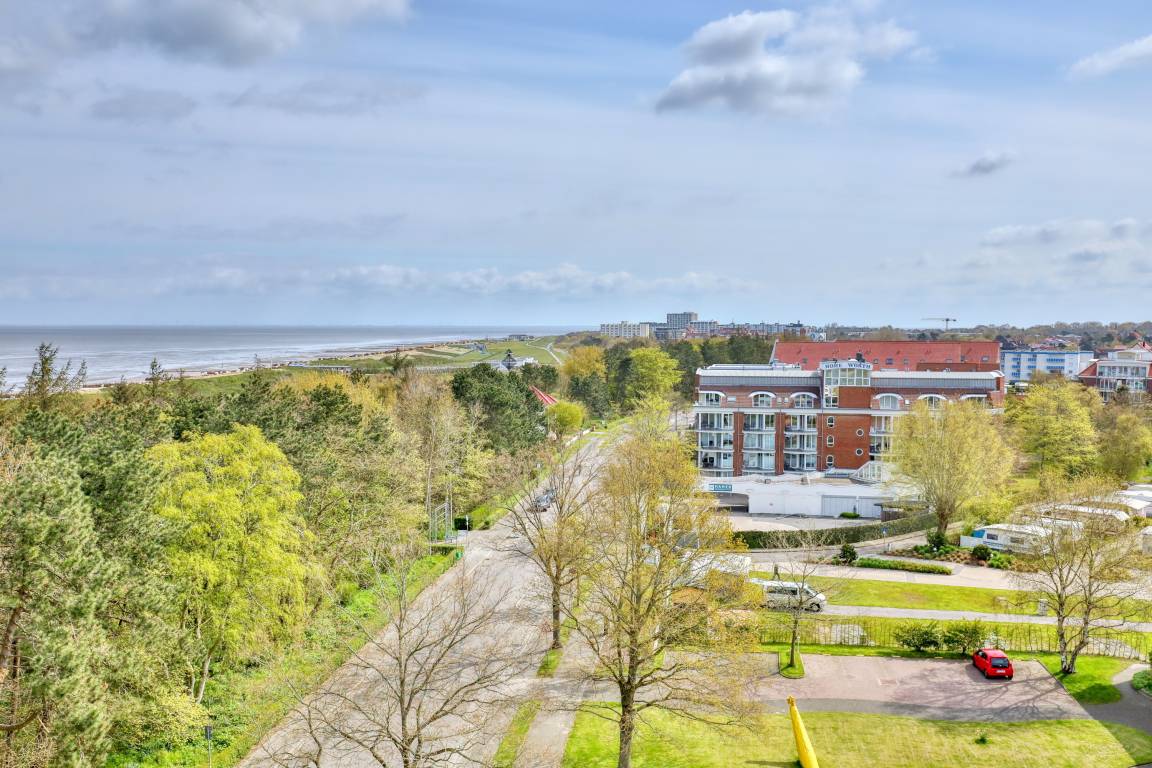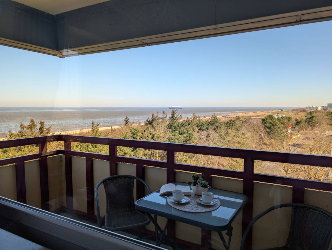 Das Appartement 96 ist ein 2-Raum-Appartement im 8. Obergeschoss für bis zu 4 Personen mit 39 qm. Der möblierte Ostbalkon mit Meerblick bietet morgens Sonne und nachmittags Schatten.