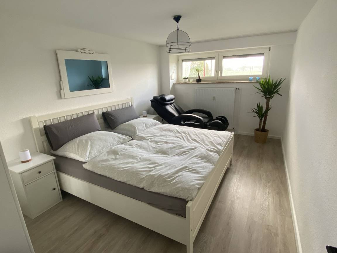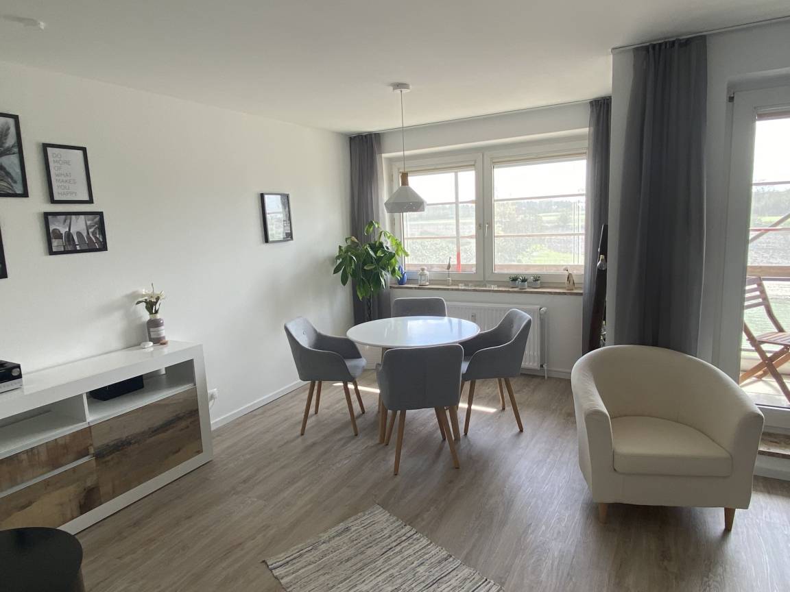 In der Wohnung "Wellness-Ferienwohnung Meeresrauschen" stehen Ihnen unter anderem ein großes Wohn-/Esszimmer (inkl. Schlafsofa) mit einer modern und komplett ausgestatteten Küche, 2 separate Schlafzimmer, ein TV-Gerät mit ausziehbarem TV-Arm, eine kleine Stereoanlage, ein hochwertiges Badezimmer, ein kleiner Abstellraum sowie ein möblierter Balkon zur Verfügung.