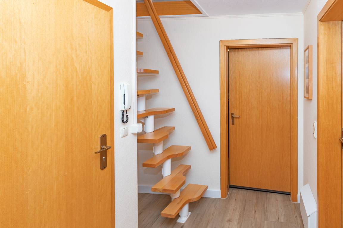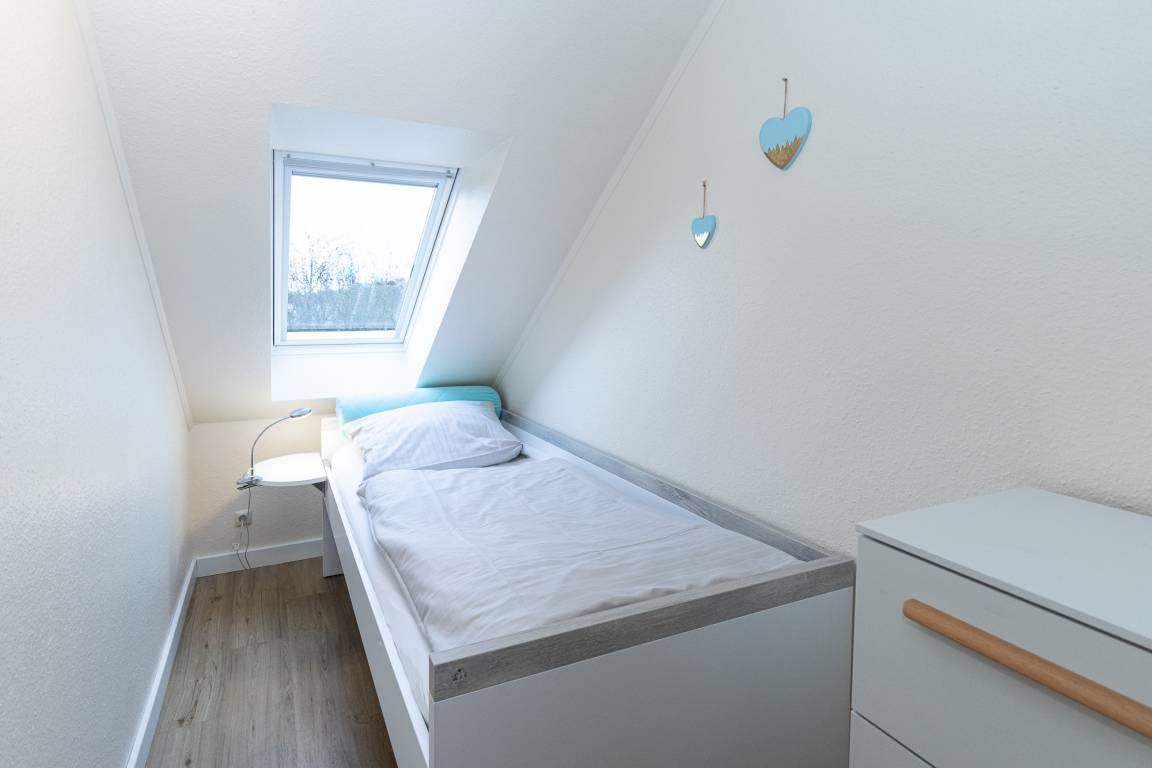 Maike 11b, 4-Raum, ca. 69m², 1. Obrgeschoss und Dachgeschoss, bis zu 5 Personen. Kostenfreier Strandkorb zum wohlfühlen am Duhner Strand. Die gemütlich und modern ausgestattete Ferienwohnung empfängt Sie im 1. Obergeschoss des Hauses und ist aufgeteilt mit einem kleinen Flur, Duschbad (Dusche/WC), Schlafzimmer mit Doppelbett und Kleiderschrank und einem weiteren Schlafbereich mit einem Einzelbett und einer Kommode, dem Wohnbereich mit großem Esstisch und der gut ausgestatteten Einbauküche. Vom Wohnbereich geht es auf den sonnigen Balkon (mit Balkonmöbeln). In dem sehr schönen ausgebauten Dachgeschoss (erreichbar über Treppe mit Sparstufen, für kleinere Kinder nur bedingt geeignet), mit Dielenboden ausgelegt, befindet sich ein weiteres Schlafzimmer mit 2 Einzelbetten und einer Sitzmöglichkeit. In diese Wohnung ist ein Baby-Reisebett leider nur sehr ungünstig zu stellen.