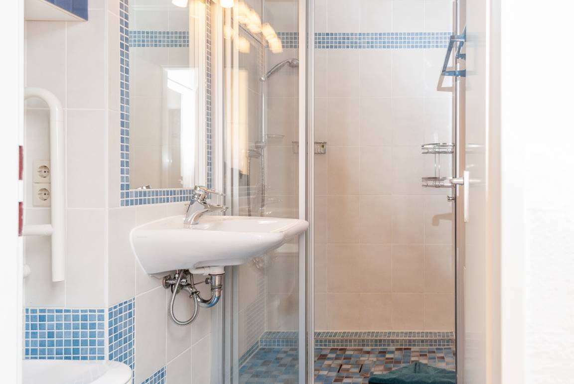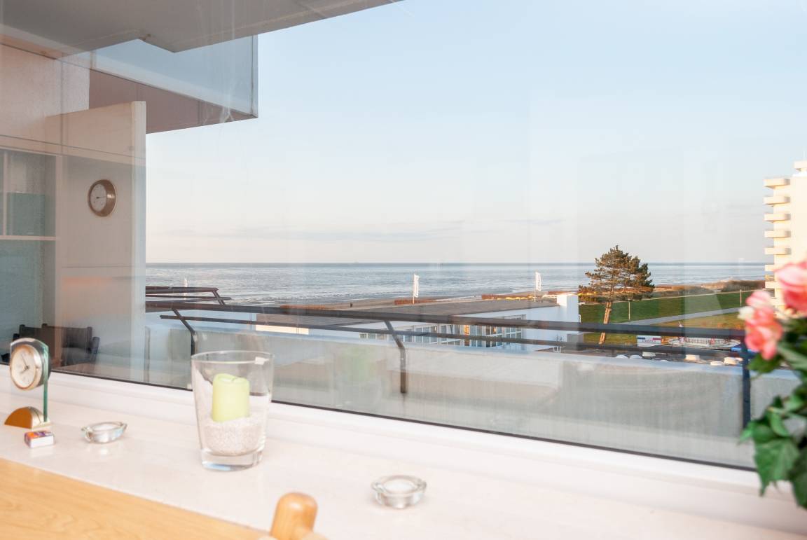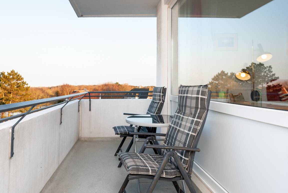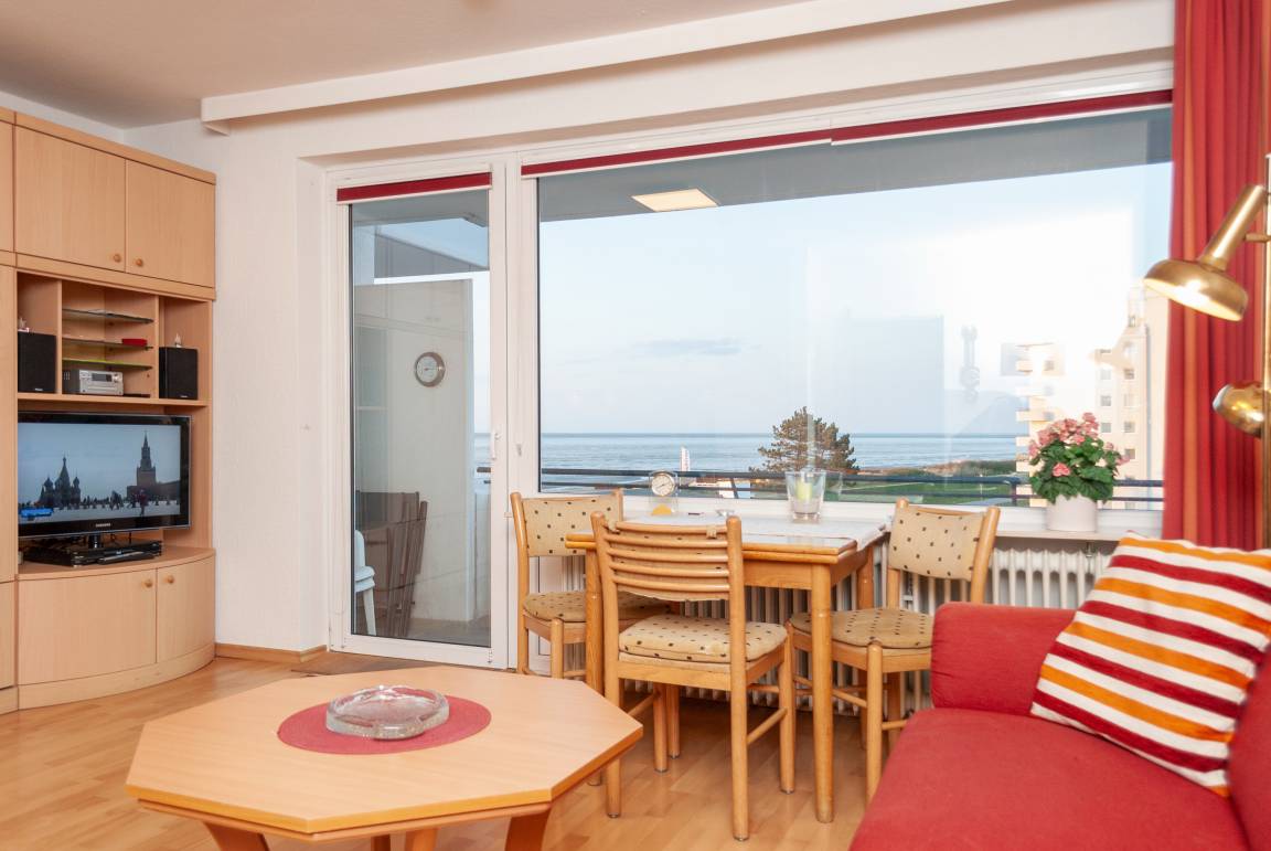 Das Apartment 412 ist ein 2-Raum-Apartment im 4. Obergeschoss für bis zu 4 Personen mit 50 qm. Der Ostbalkon mit Meerblick bietet Ihnen vormittags Sonne und nachmittags Schatten.