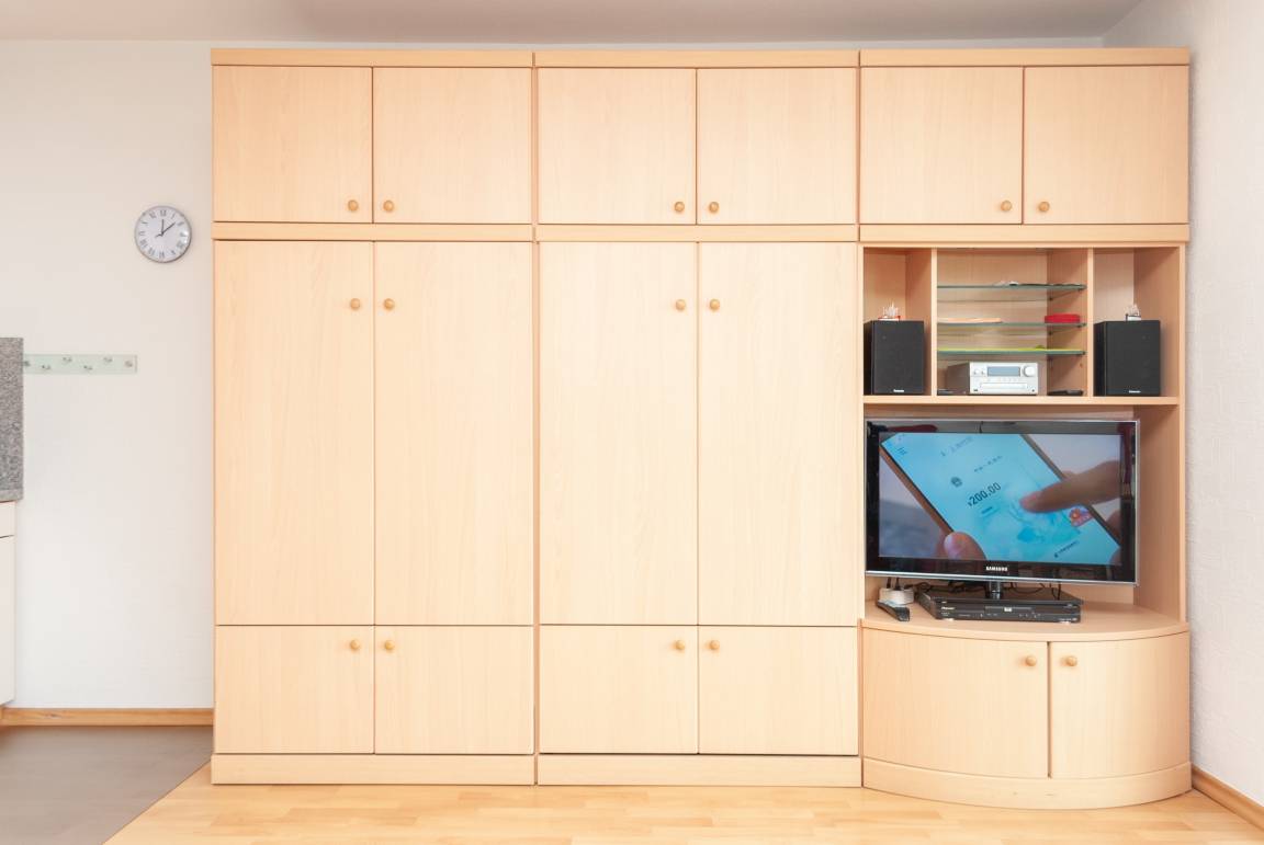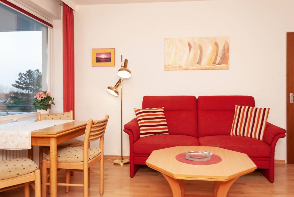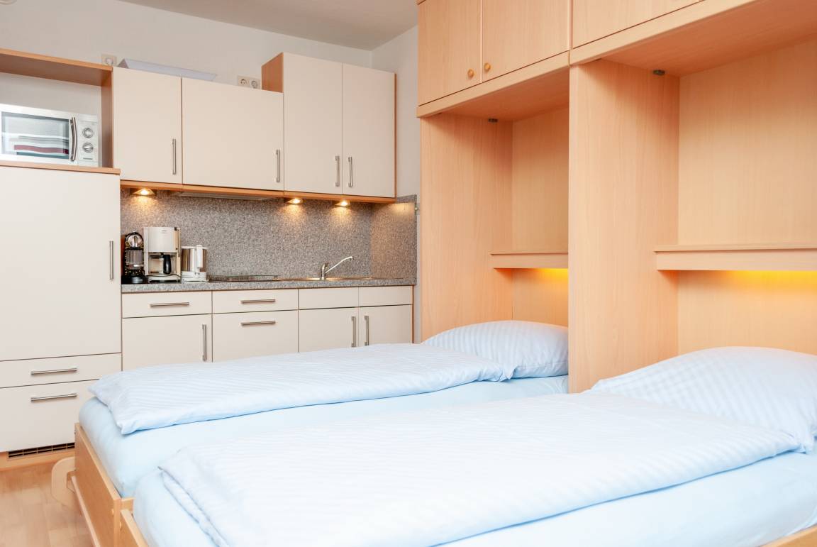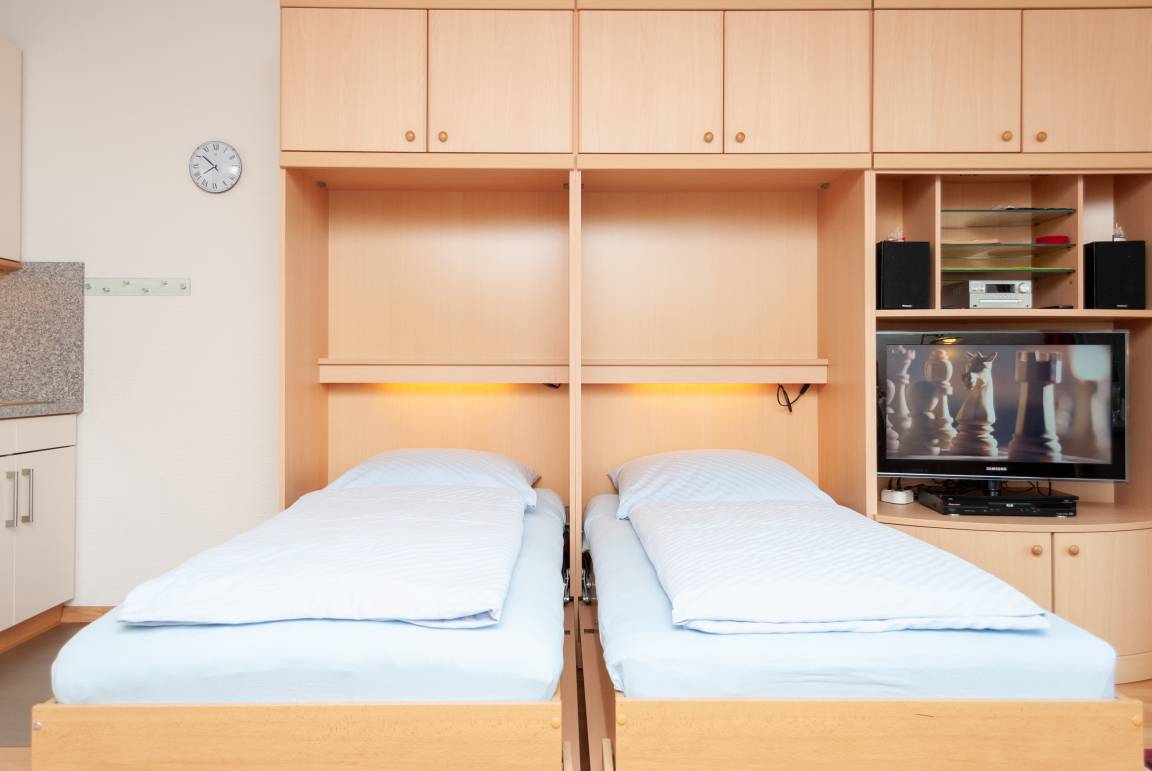 Das Apartment besteht aus einem Schlafzimmer mit 2 Einzelbetten, einem Wohnbereich mit zusätzlichem Schrankbett für 2 Personen und einem Badezimmer mit Dusche sowie WC. Die Ferienwohnung beinhaltet eine voll ausgestattete offene Küche.