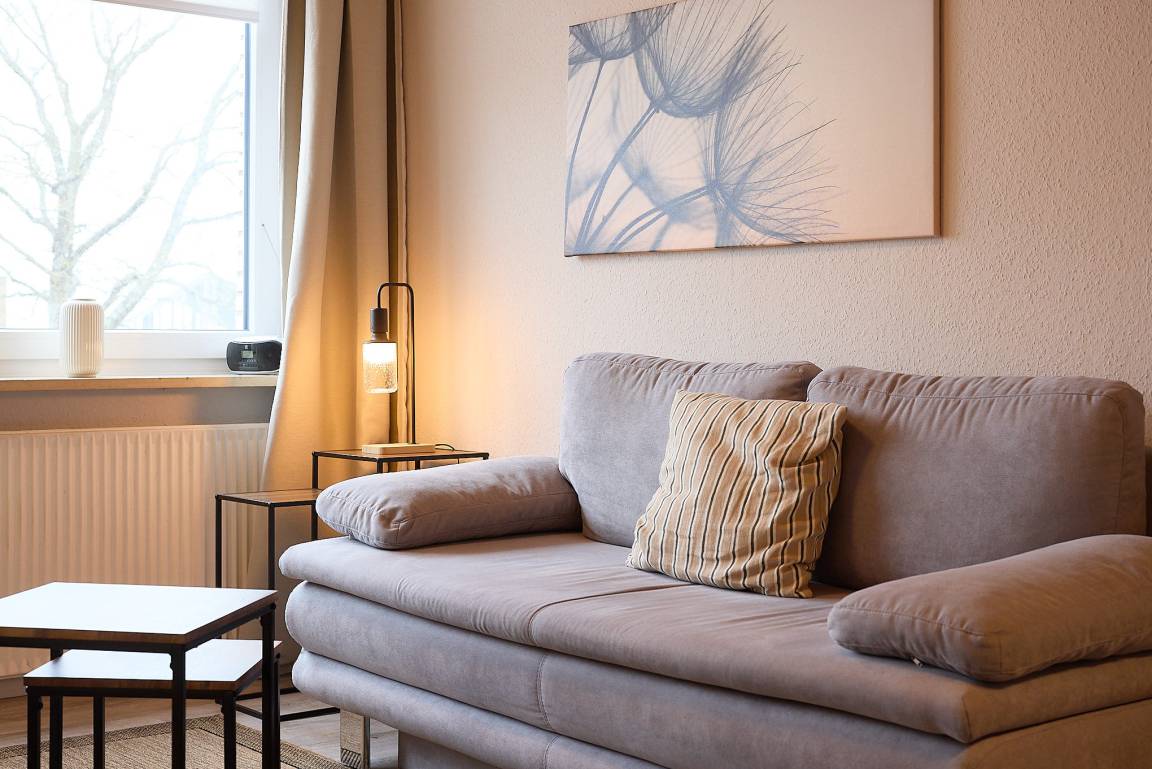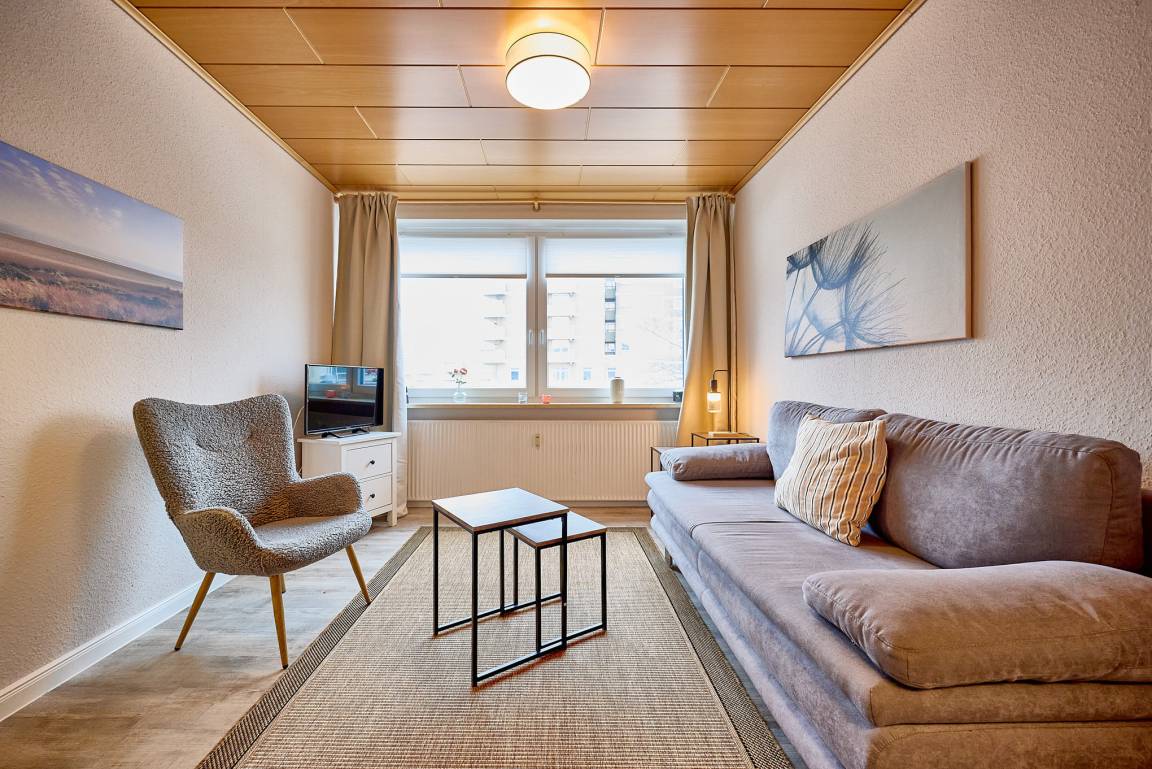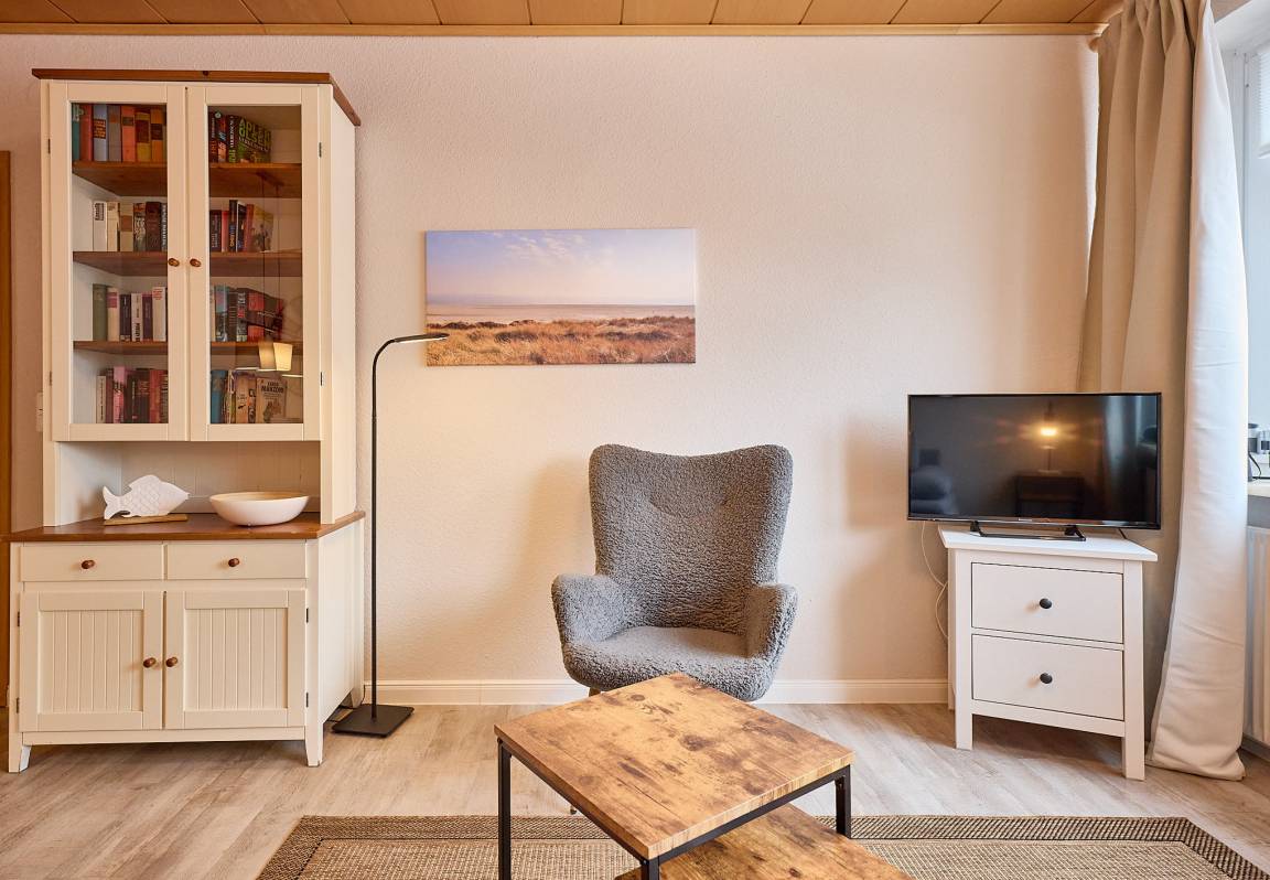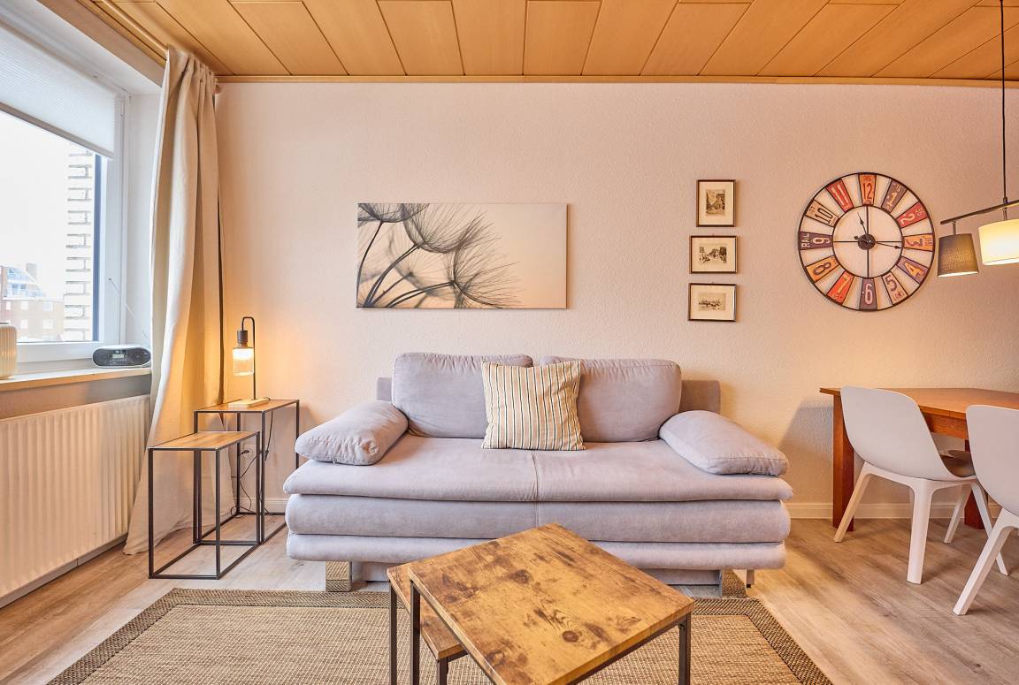 Der Wohnbereich ist gemütlich eingerichtet und bietet mit einer Schlafcouch einen angenehmen Ort zum Entspannen. Von hier aus genießen Sie den Blick auf den Duhner Dorfbrunnen sowie entlang der Strandstraße einen kleinen Blick Richtung Nordseehorizont. Das lebendige Treiben der Fußgängerzone sorgt auch hier für maritimes Urlaubsflair.