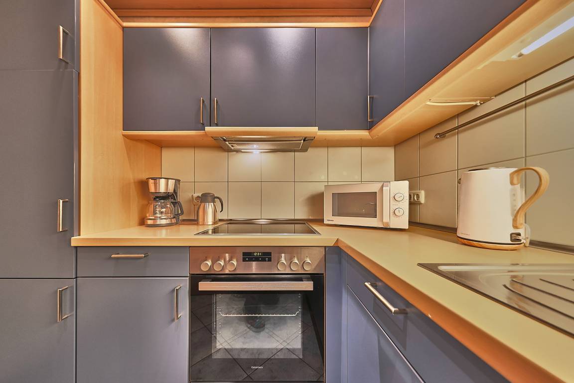 Der separate Küchenbereich ist funktional ausgestattet und bietet alles, was Sie für die tägliche Selbstverpflegung benötigen.
