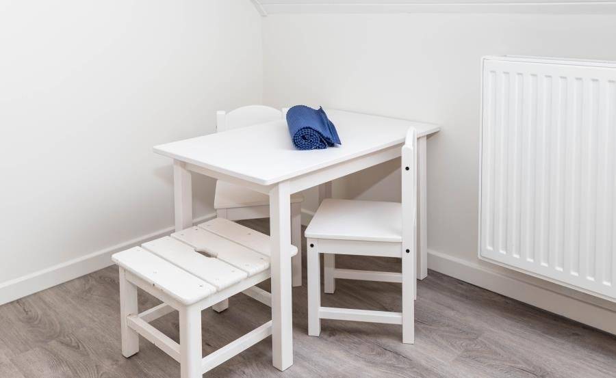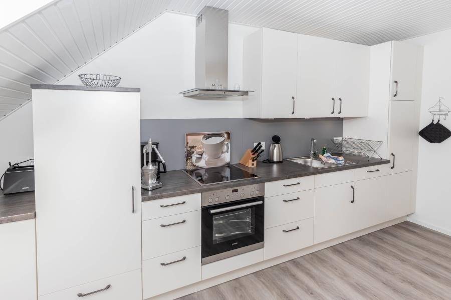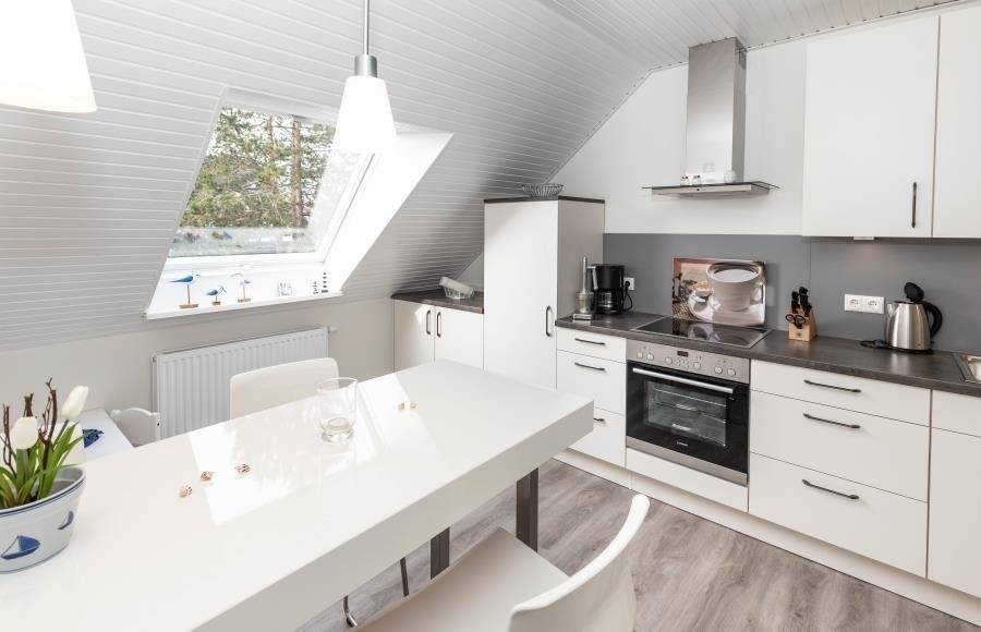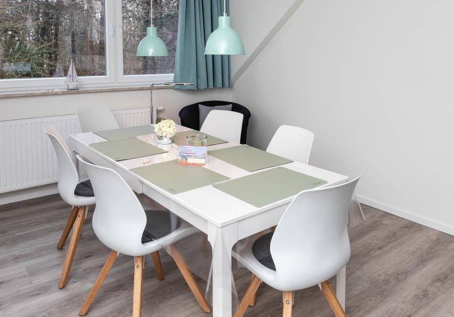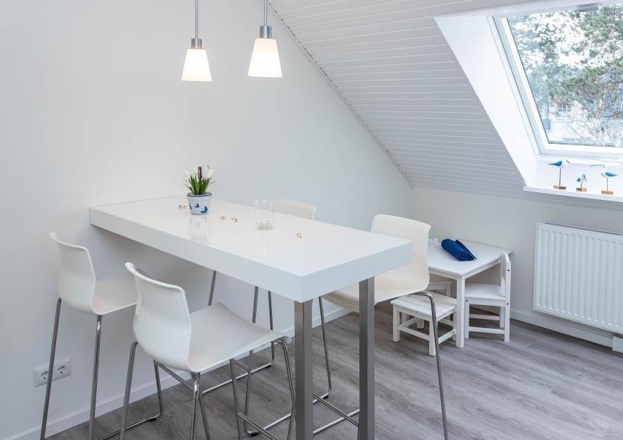 Die separate Küche ist modern gestaltet und mit einer praktischen Sitztheke ausgestattet. Hier macht gemeinsames Kochen Spaß. Besonders familienfreundlich: Für die kleinsten Gäste steht ein eigener Tisch mit zwei Stühlen bereit. Zum gemeinsamen Essen lädt anschließend der Esstisch mit sechs Sitzplätzen ein.