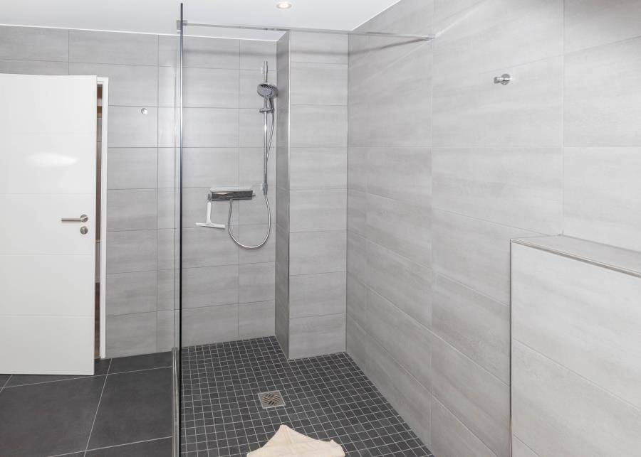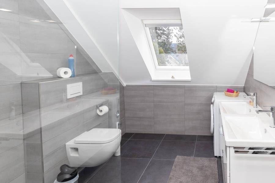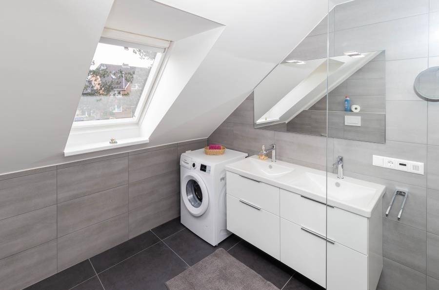 Das moderne Badezimmer ist großzügig gestaltet und bietet eine große Dusche, einen Doppelwaschtisch, WC sowie ein Fenster für Tageslicht. Eine Waschmaschine steht Ihnen ebenfalls in der Wohnung zur Verfügung.