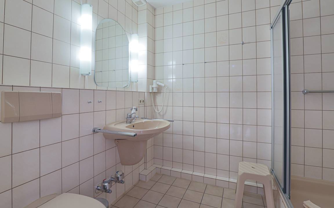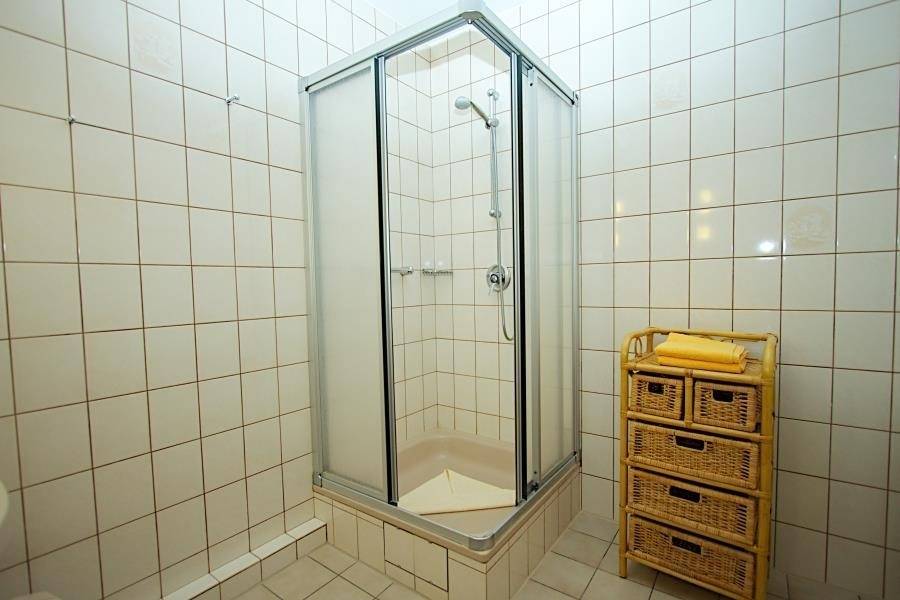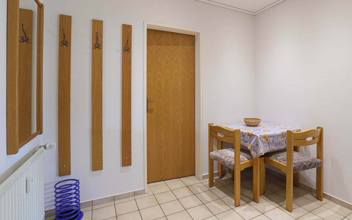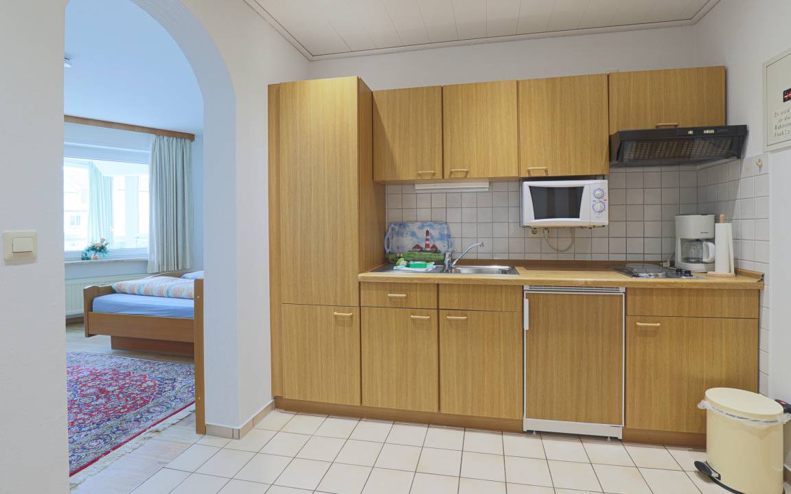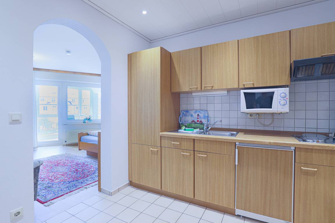 Die gut ausgestattete Pantryküche mit Kühlschrank, Spüle, 2 Kochplatten, Mikrowellengerät, Kaffeemaschine und Wasserkocher ist in einer Nische im großen Flur integriert. Das innenliegende Duschbad mit WC ist ebenfalls vom Flur aus erreichbar.
