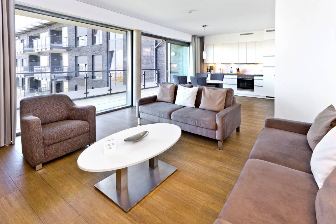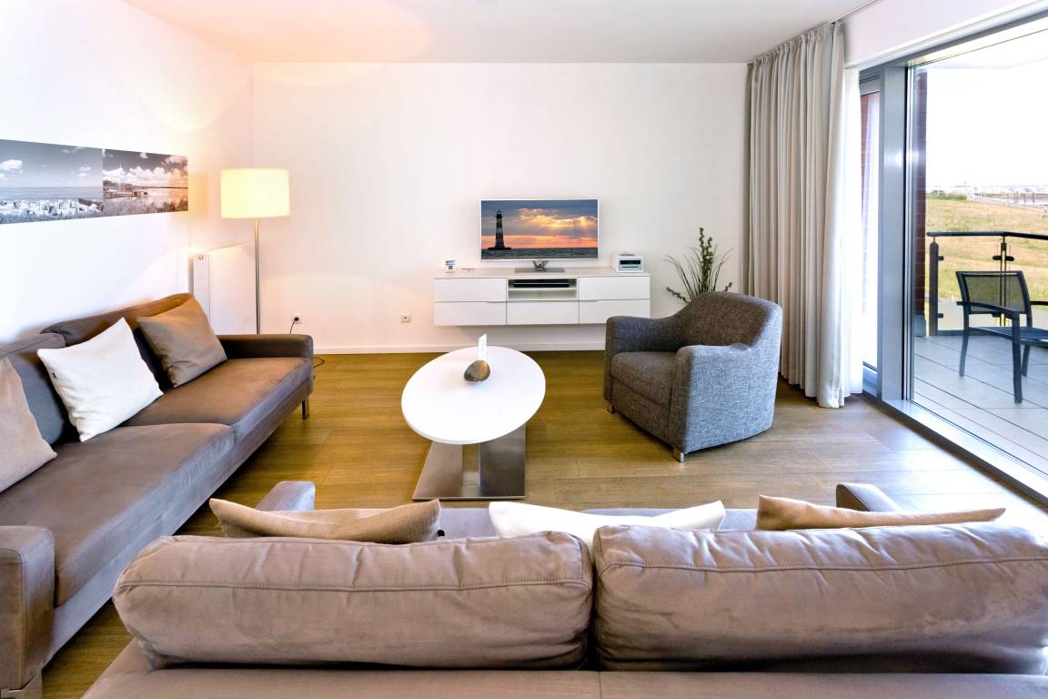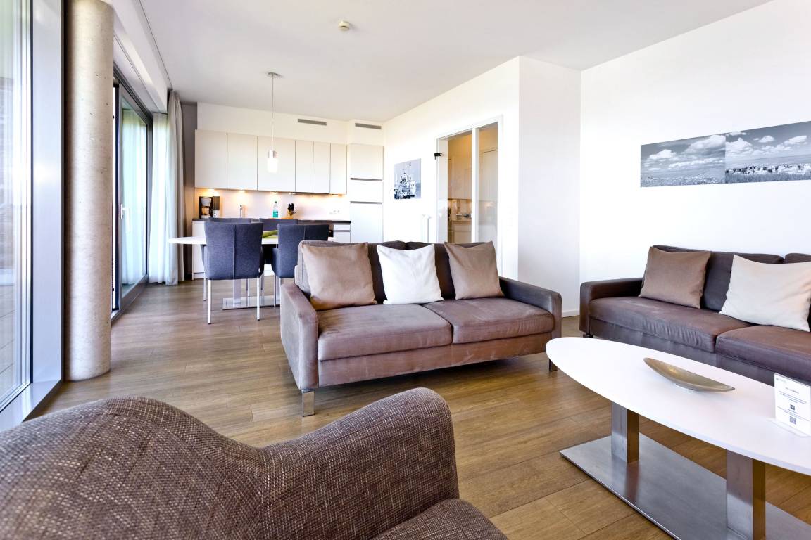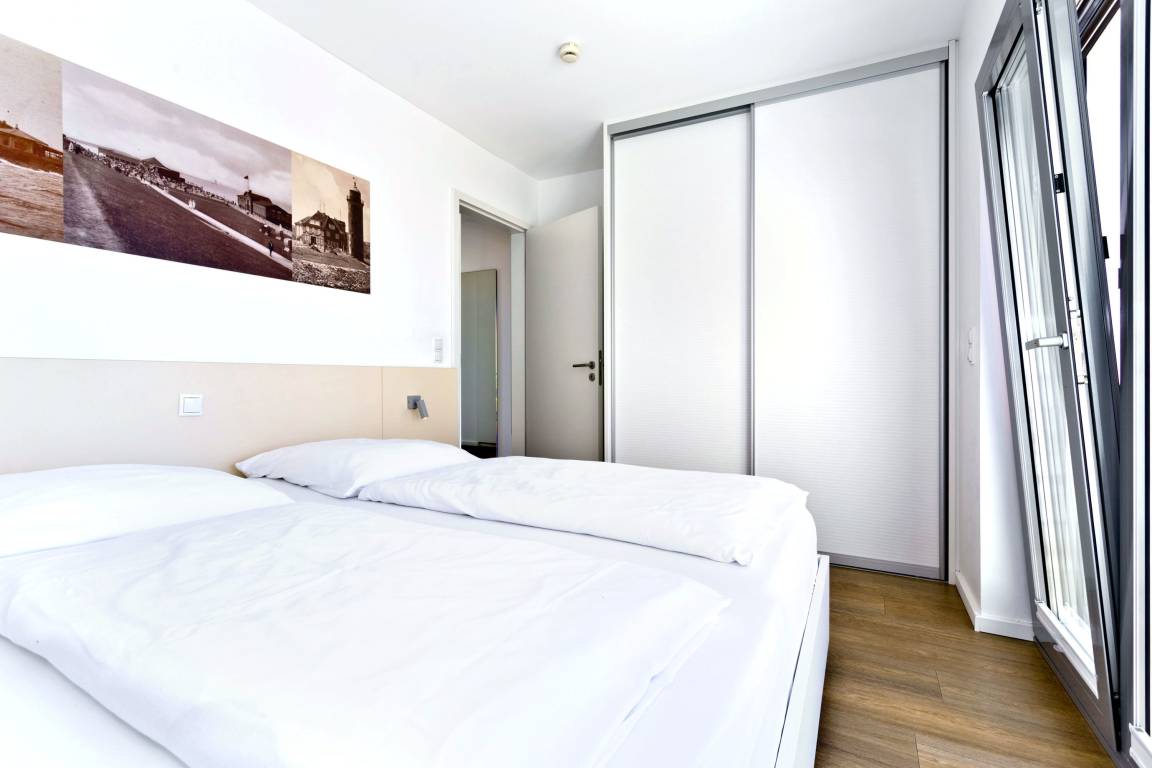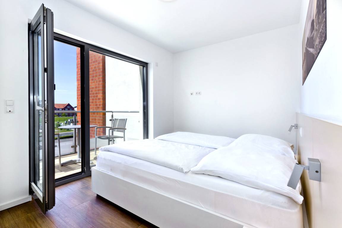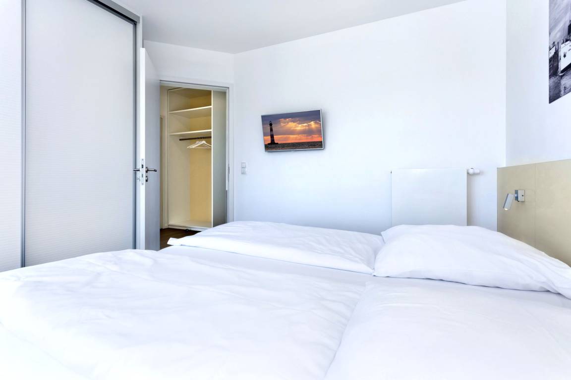 Seesicht und Südbalkon!. Komfortable 3 Zi. Luxus-Wohnung über 91m², 2. Etage, großzügiges Wohnzimmer mit großem Balkon (nord), ein weiterer Balkon zur Südseite an den Schlafzimmern, vollständig ausgestattete Küchenzeile, 2 Schlafzimmer mit Doppelbetten und Außenjalousien, 2xTV, DVD, Radio/CD, kostenloses W-Lan-Internet, 1xDu/WC, 1x Gäste-WC, reservierter Außenstellplatz, freie Saunanutzung, Nichtraucher, keine Haustiere.