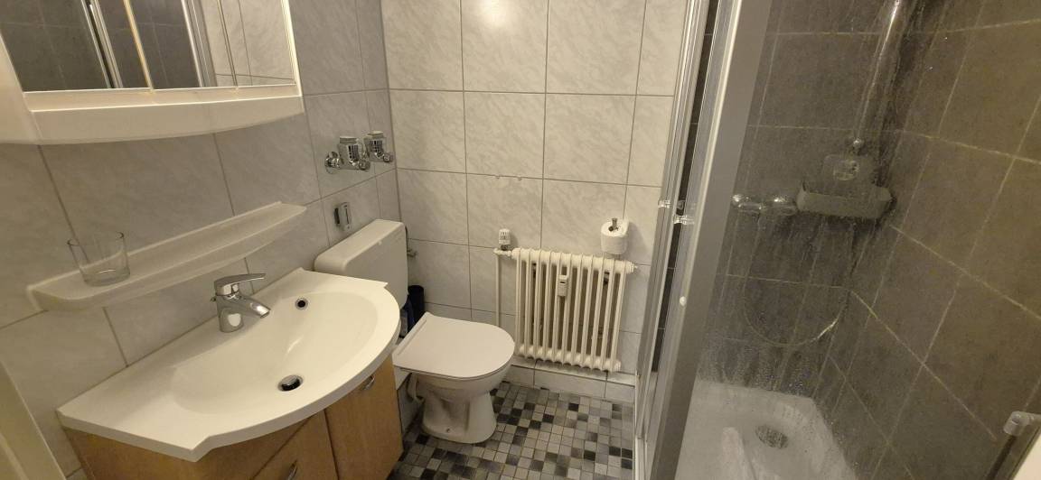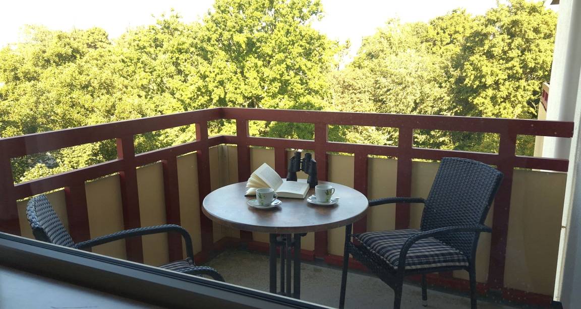 Das Appartement 46 ist ein 1-Raum-Apartment im 4. Obergeschoss für bis zu 4 Personen mit 38 qm. Der möblierte Westbalkon bietet morgens Schatten und nachmittags Sonne.