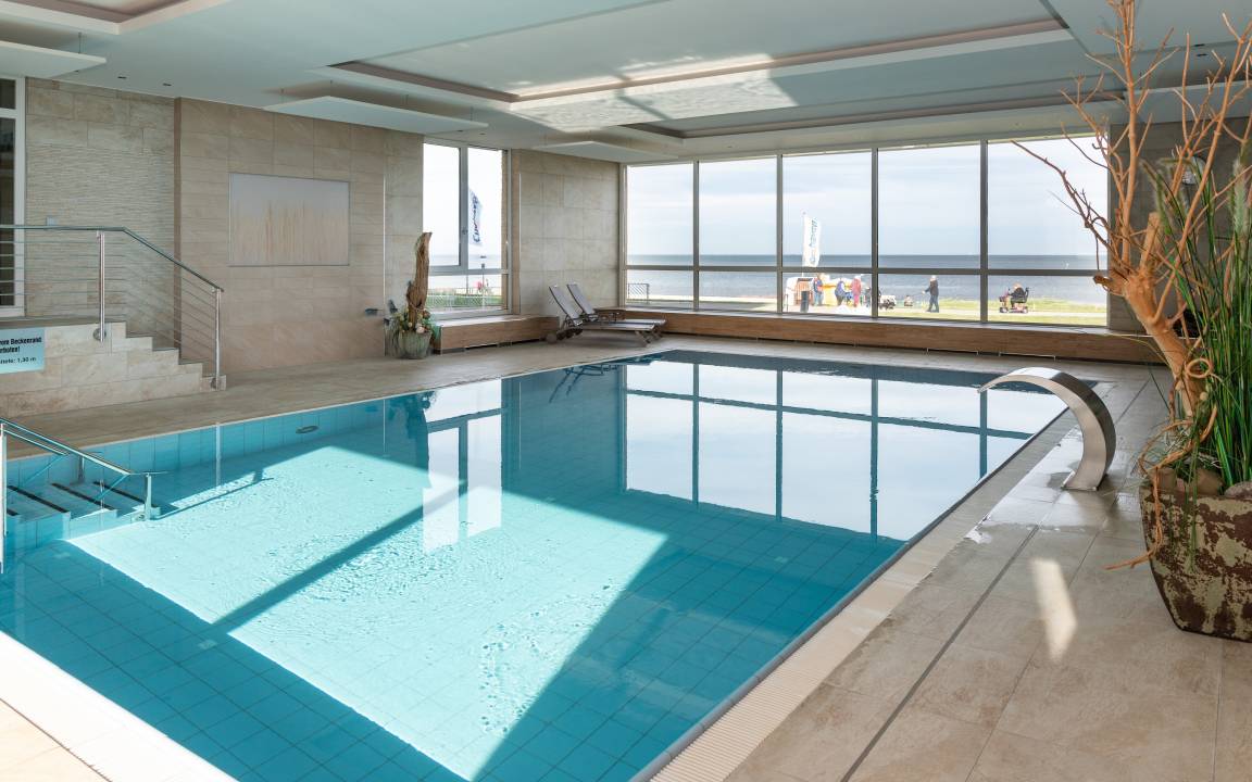 Ein besonderes Highlight ist das Schwimmbad im 1. Obergeschoss mit großen Panoramafenstern und direktem Blick auf Strand und Nordsee. Ergänzt wird der Wellnessbereich durch Sauna, Ruheräume und Balkone mit weitem Meerblick. Die jährliche Wartung findet meist in der Wintersaison (ca. Januar, 2–3 Wochen) statt.