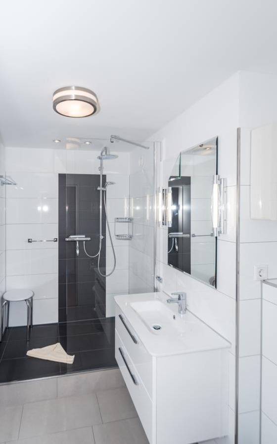 Das moderne Duschbad ist funktional und ästhetisch gestaltet und verfügt über praktische Ablageflächen für Ihre Badutensilien. Alles ist auf Komfort und einfache Nutzung ausgerichtet.