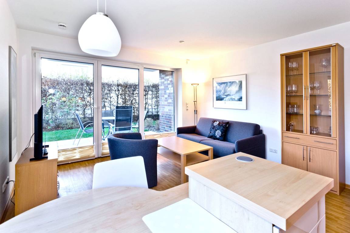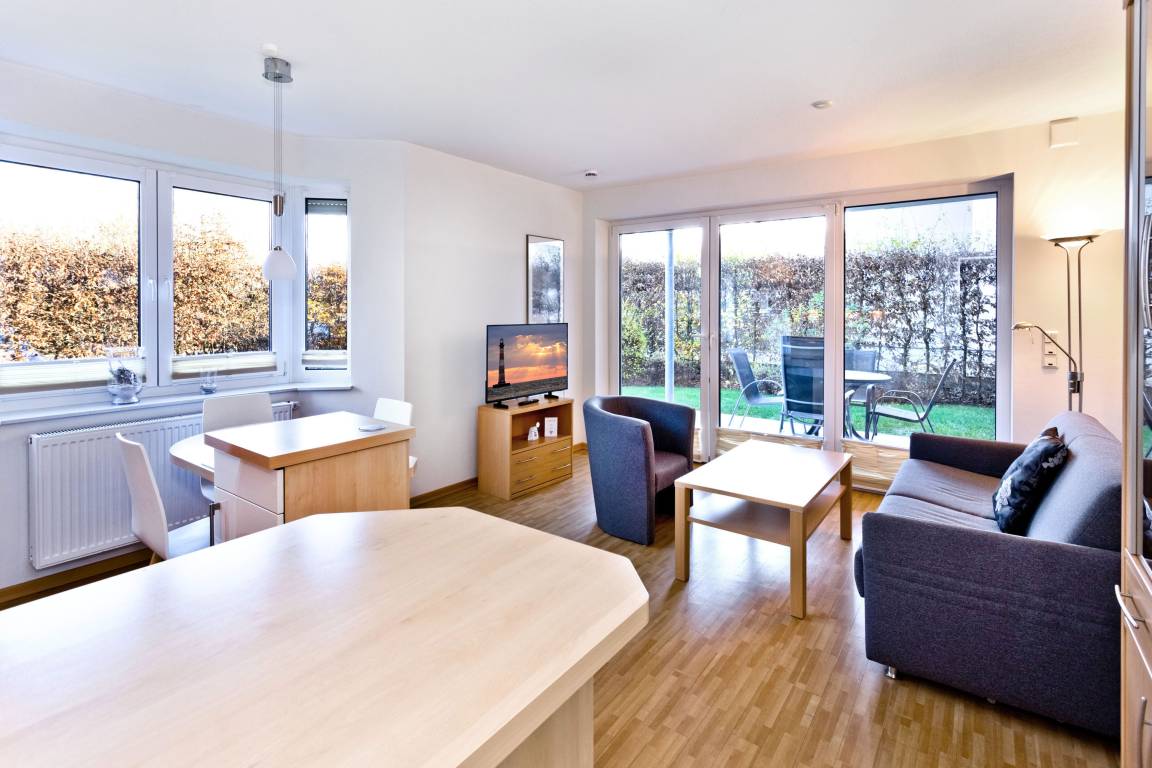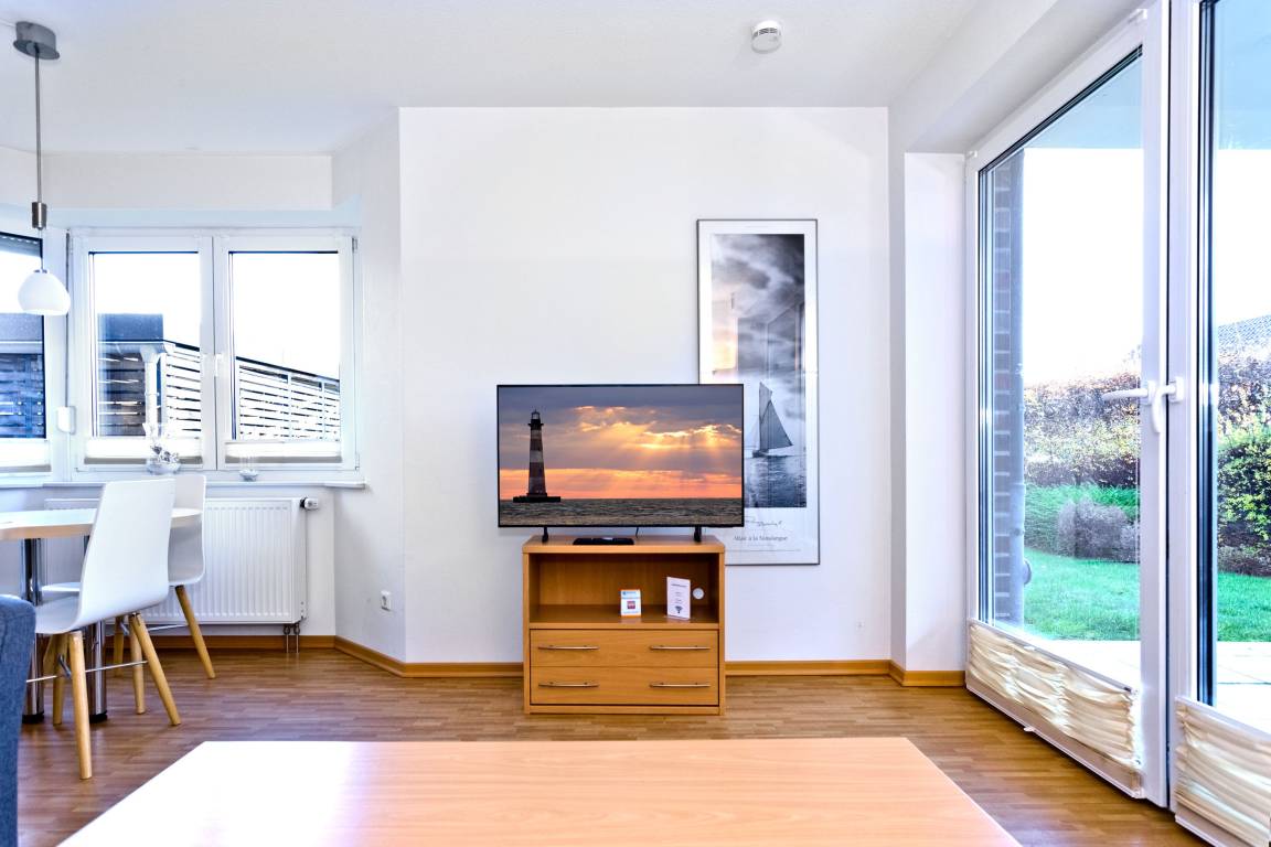 Schöne und vollständig ausgestattete, barrierefreie Wohnung auf ca. 49m² (Türen 1m breit) für bis zu 3 Personen. Parterre mit Terrasse und Rasen (süd), 1 Schlafzimmer mit Doppelbett, Wohnzimmer mit Schlafcouch, SAT-TV, W-LAN kostenlos, vollständige Küchenzeile mit Geschirrspüler, Mikrowelle, Backofen, Gefrierfach, Du/Wc mit ebenerdiger Dusche, Föhn, alle Räume mit Rollladen zu verdunkeln, reservierter Pkw-Stellplatz #10. Natürlich Nichtraucher und keine Haustiere gestattet.