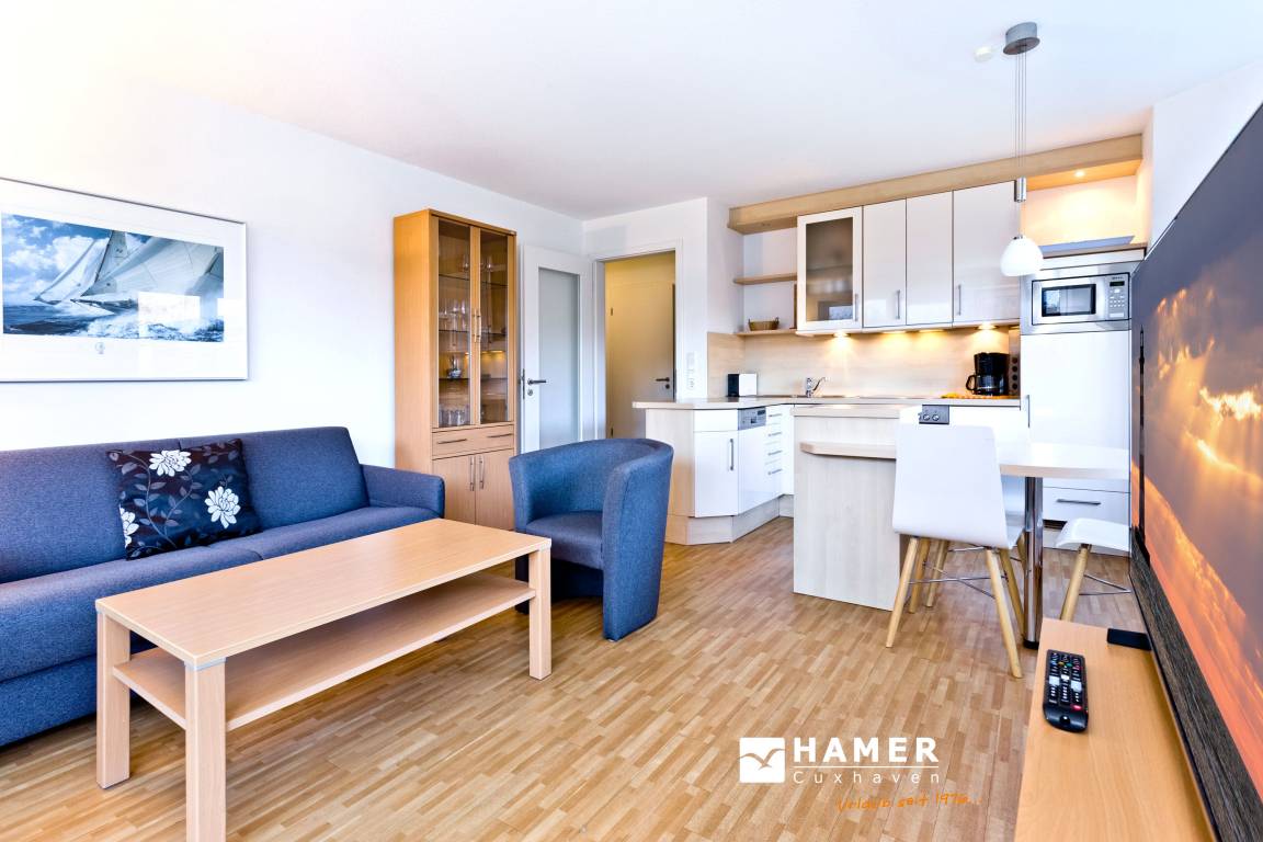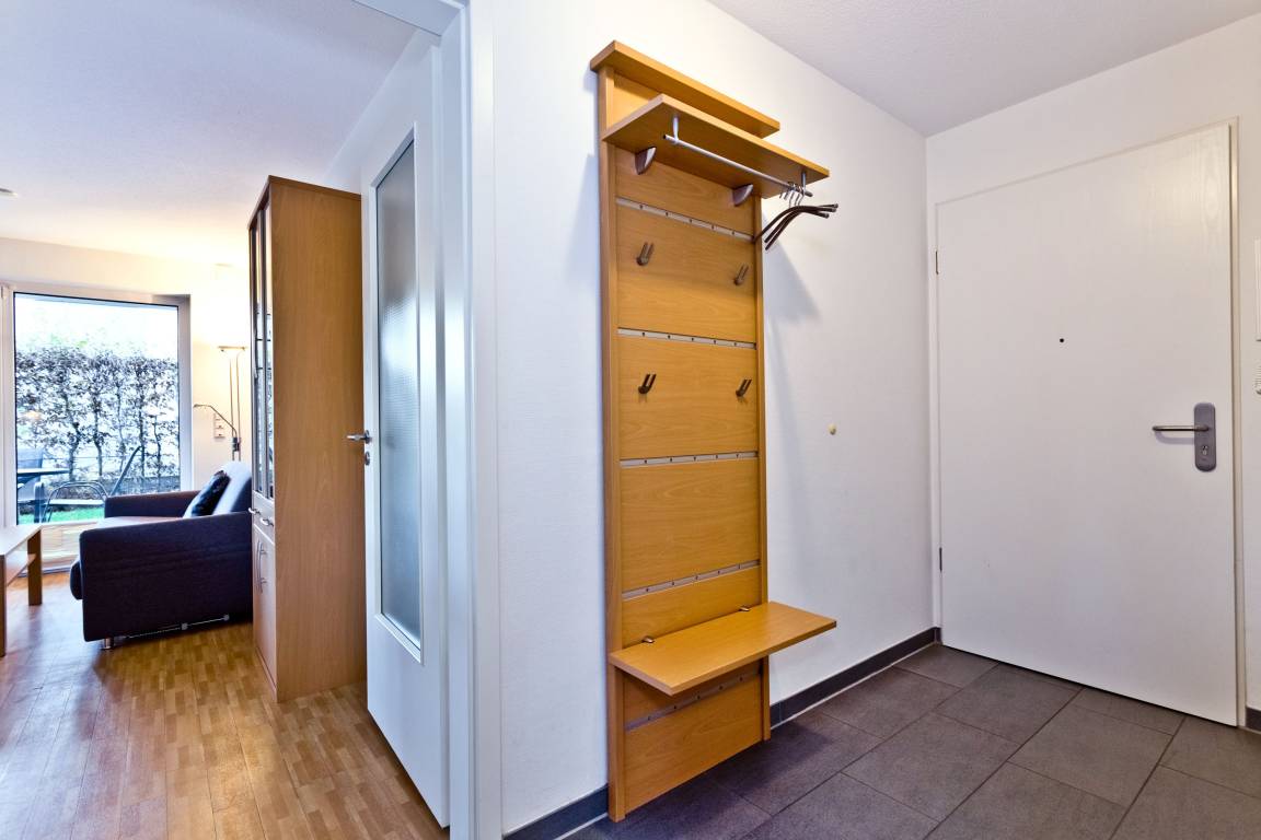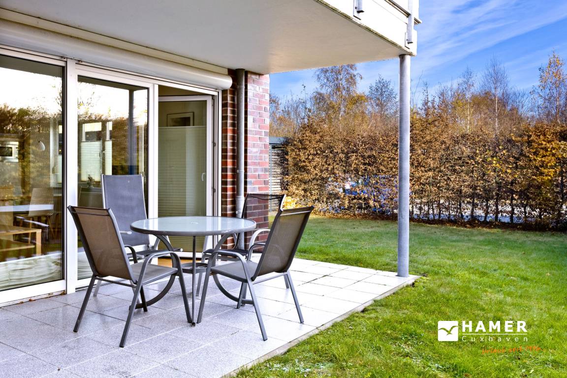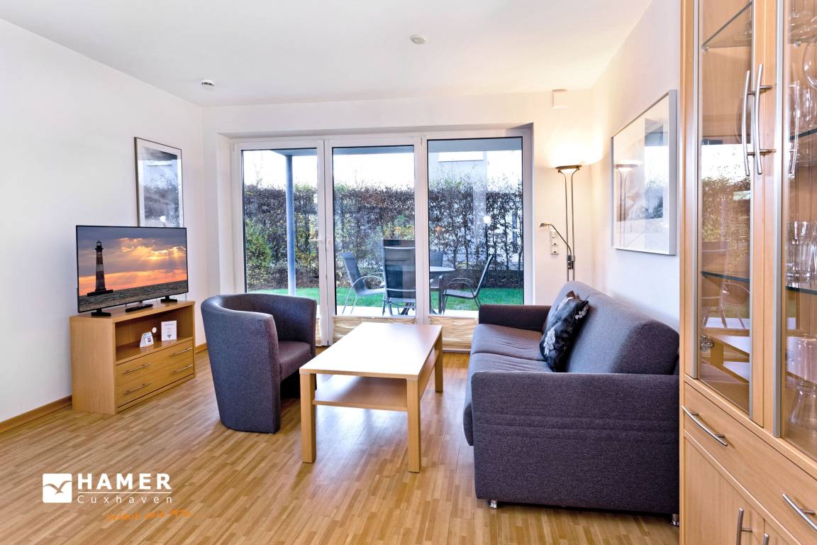 Schöne und vollständig ausgestattete, barrierefreie Wohnung auf ca. 49m² (Türen 1m breit) für bis zu 3 Personen. Parterre mit Terrasse und Rasen (süd), 1 Schlafzimmer mit Doppelbett, Wohnzimmer mit Schlafcouch, SAT-TV, W-LAN kostenlos, vollständige Küchenzeile mit Geschirrspüler, Mikrowelle, Backofen, Gefrierfach, Du/Wc mit ebenerdiger Dusche, Föhn, alle Räume mit Rollladen zu verdunkeln, reservierter Pkw-Stellplatz #10. Natürlich Nichtraucher und keine Haustiere gestattet.