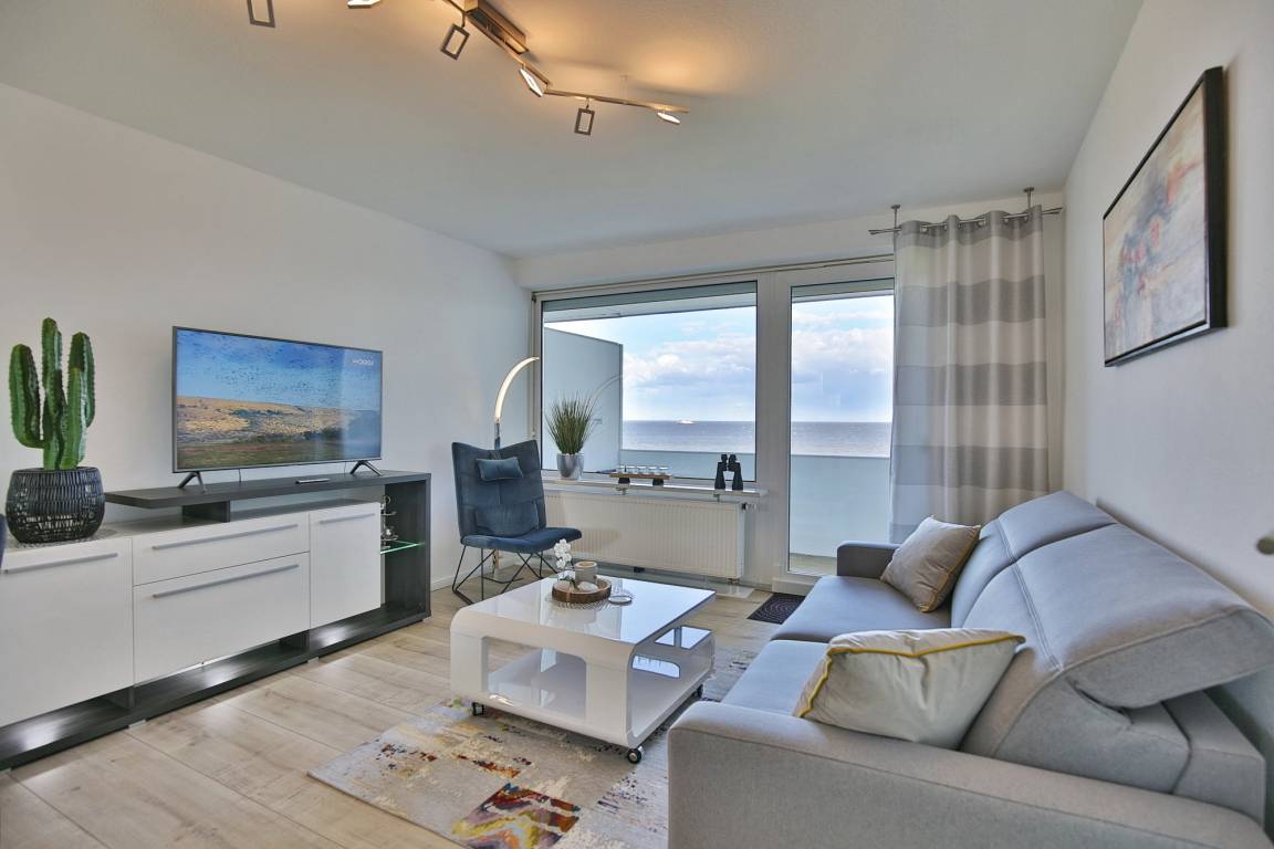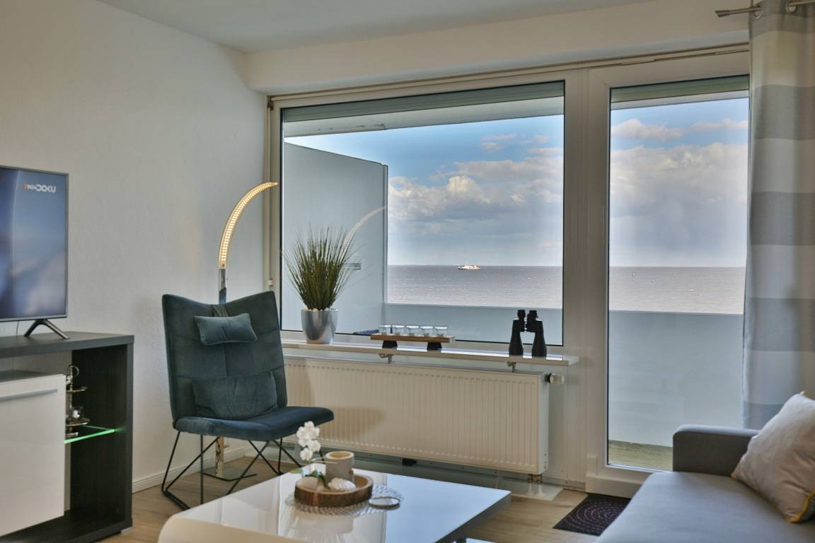 Ferienwohnung Nautic 614 besticht durch eine moderne Ausstattung und ein gemütliches Ambiente sowie einen sensationellen Ausblick aus der 6. Etage. Genießen Sie den einmaligen Blick auf den Fährhafen, die Grimmershörnbucht sowie faszinierende Sonnenaufgänge beim allmorgendlichen Kaffee.