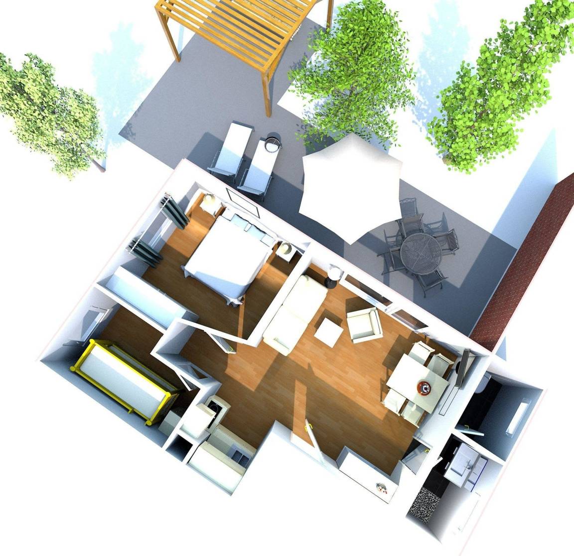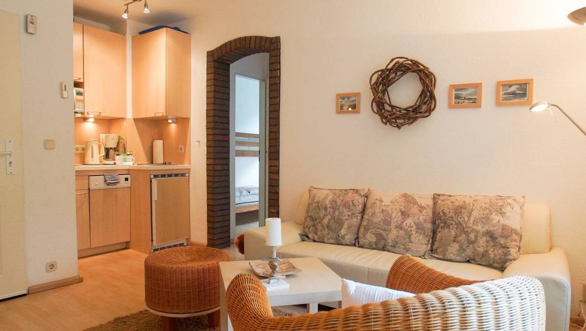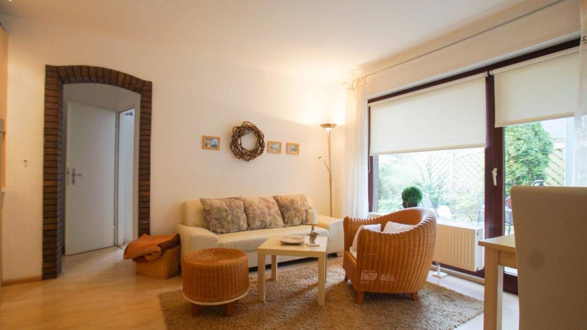 Das helle 3-Raum-Apartment Wexler 26a/2 im Erdgeschoss bietet auf 40 qm Platz für bis zu 4 Personen. Die liebevoll gestaltete Ferienwohnung verfügt über einen großzügigen Wohnbereich mit einer gut ausgestatteten Küchenzeile und einer gemütlichen Sofaecke. Zwei separate Schlafzimmer ermöglichen erholsame Nächte – eines mit einem Doppelbett und das andere mit zwei Einzelbetten. Das moderne Bad ist mit einer ebenerdigen Dusche ausgestattet. Im Haus stehen Waschmaschine und Trockner zur allgemeinen Nutzung bereit. Für Fahrräder sind Unterstellmöglichkeiten vorhanden, sowie ein PKW-Stellplatz. Die zum Teil überdachte, möblierte Terrasse lädt zum Entspannen ein und ein Grill steht zur Verfügung.