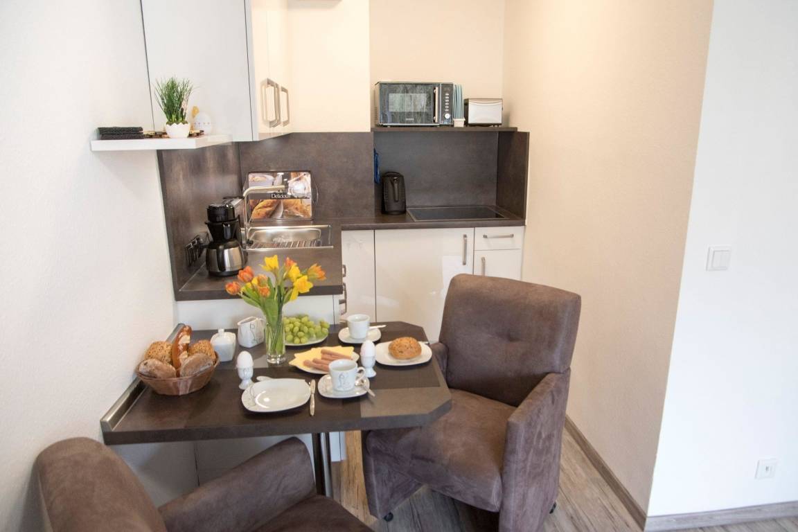 Diese moderne Ferienunterkunft im Haus Frauenpreiss befindet sich im ersten Stock und bietet auf 32 qm Platz für bis zu zwei Personen. Der offene Wohnbereich wartet mit einer gemütlichen Sofaecke auf, die sich leicht in ein Doppelbett verwandeln lässt. Der Essbereich ist ideal für gemeinsame Mahlzeiten. Die vollständig ausgestattete Küche bietet ein Cerankochfeld, eine Spülmaschine, Mikrowelle, Kühlschrank sowie diverse Küchengeräte. Zur Ausstattung gehören außerdem ein TV und kostenfreies WLAN.
