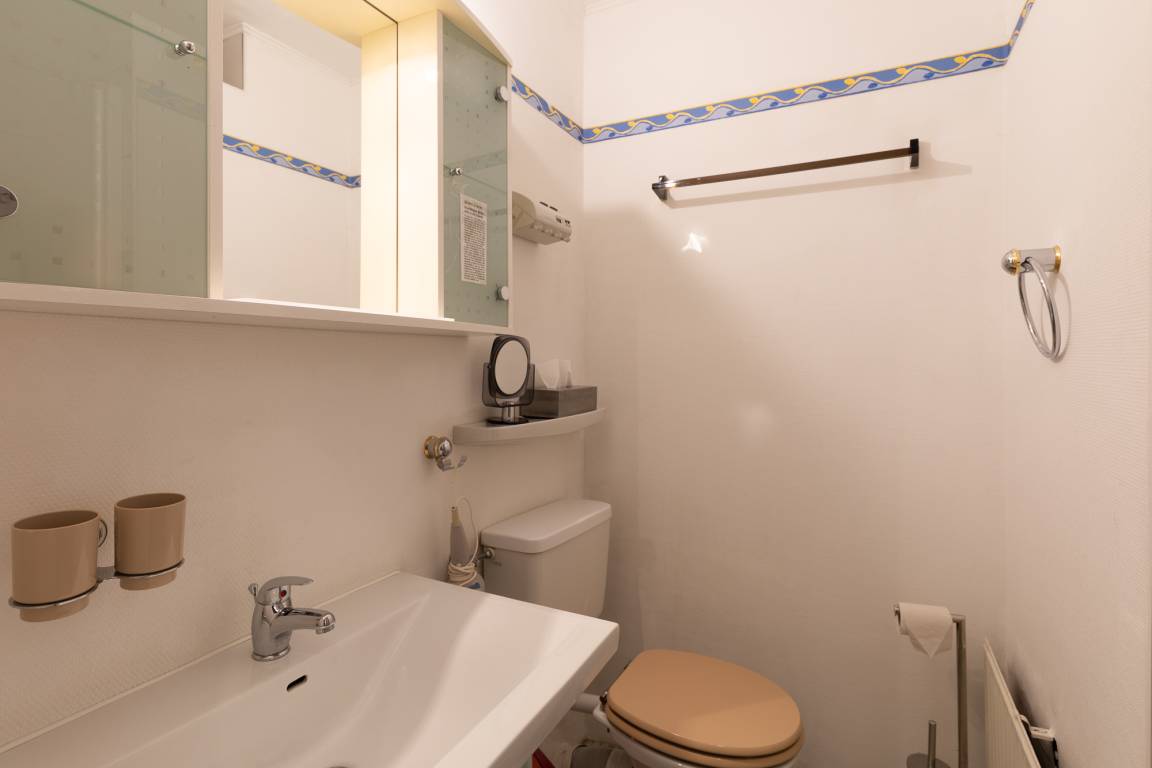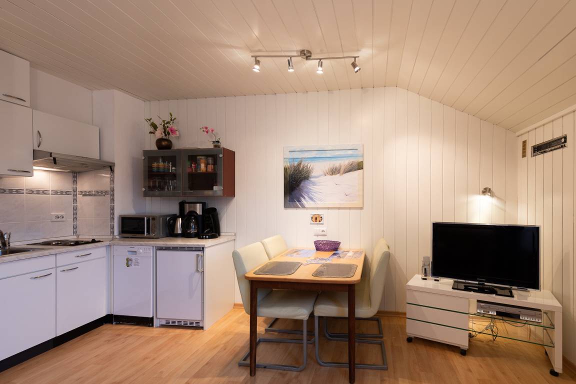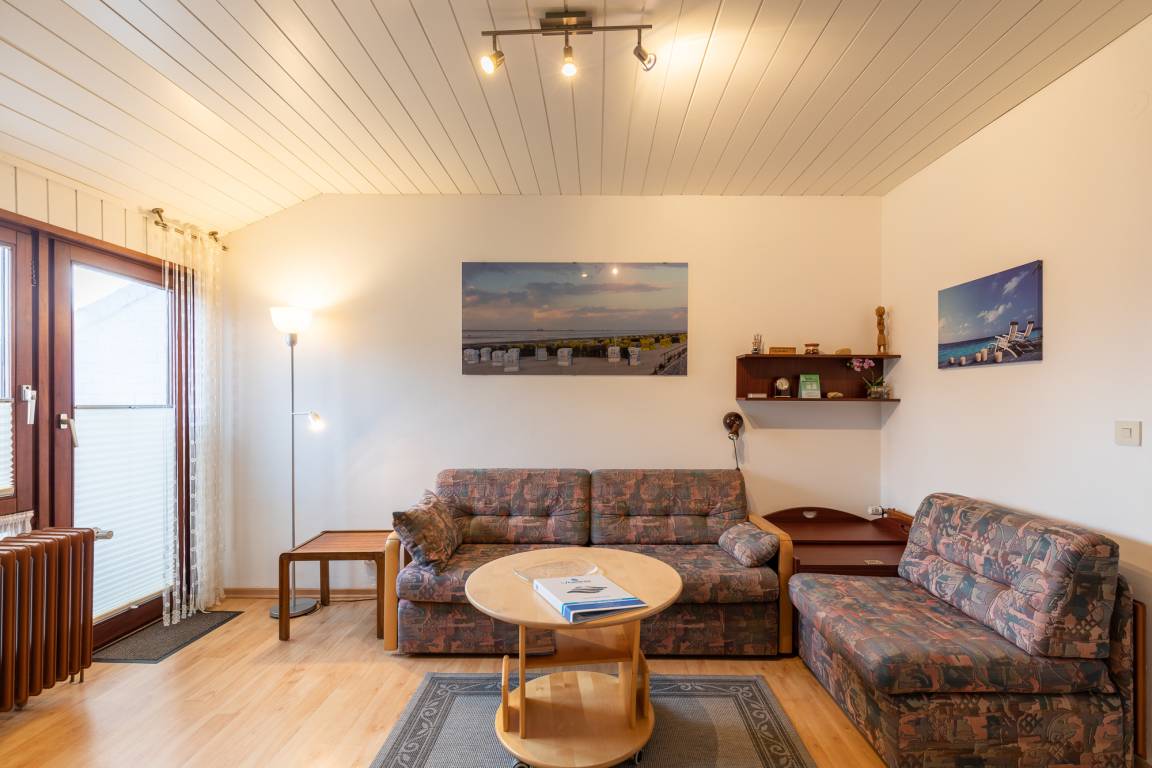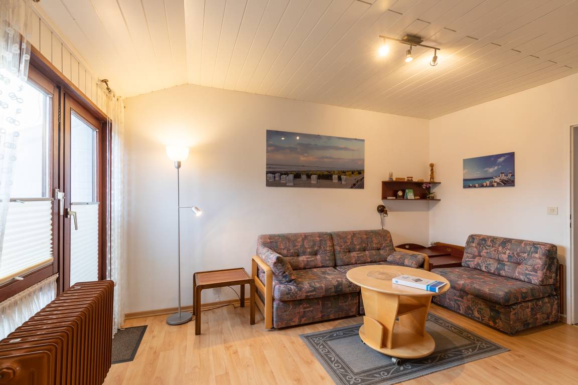 Ein Schlafzimmer mit zwei Einzelbetten + einem Kleiderschrank. Ein Wohnzimmer mit Küchenzeile (Kaffee- und Pad-Maschine, Heißwasser- und Eierkocher, Heißluft/Grill-Mikrowelle, Kühlschrank mit Gefrierfach, Geschirrspülmaschine, 2 Kochplatten), Essplatz, zweitüriger Einbauschrank, Wäscheständer, Staubsauger, Schlaf-Sofa, Sat TV. Balkon mit Sitzmöbel. Bad mit ebenerdiger Dusche + Föhn. Gegensprechanlage/Türöffner. Nichtraucherhaus, keine Haustiere, kostenloser PKW-Stellplatz direkt am Haus, Fahrradunterstand hinterm Haus.