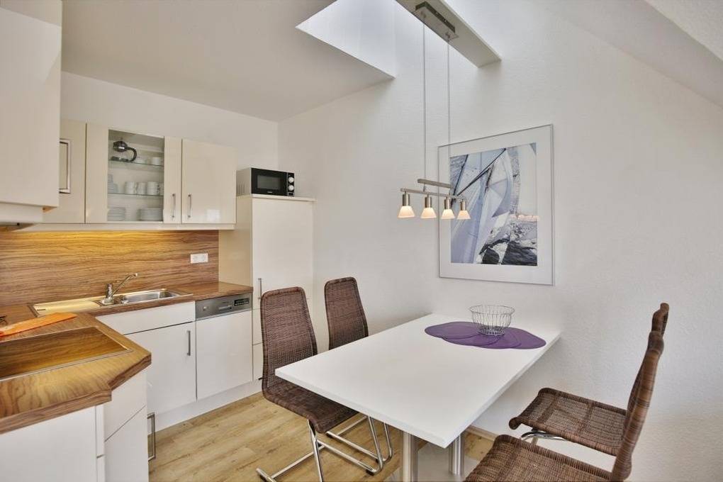 Sehr schöne, helle 3-Raum-Maisonette-Wohnung, 1.Etage, 1 Schlafzimmer mit Doppelb., 1 Schlafzimmer im Dachgeschoss mit Doppelbett und separaten WC, kostenloses W-LAN Internet, Wohnzimmer mit Küchenzeile (Backofen, Mikrowelle, Geschirrspüler) 2x SAT-TV, Du/Wc, großer Balkon (süd) mit Balkonmöbeln und Sonnenschirm (saisonabhängig), Rollladen, reservierter Pkw-Stellplatz vor dem Haus, keine Haustiere erlaubt, Nichtraucher.