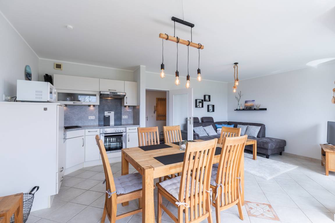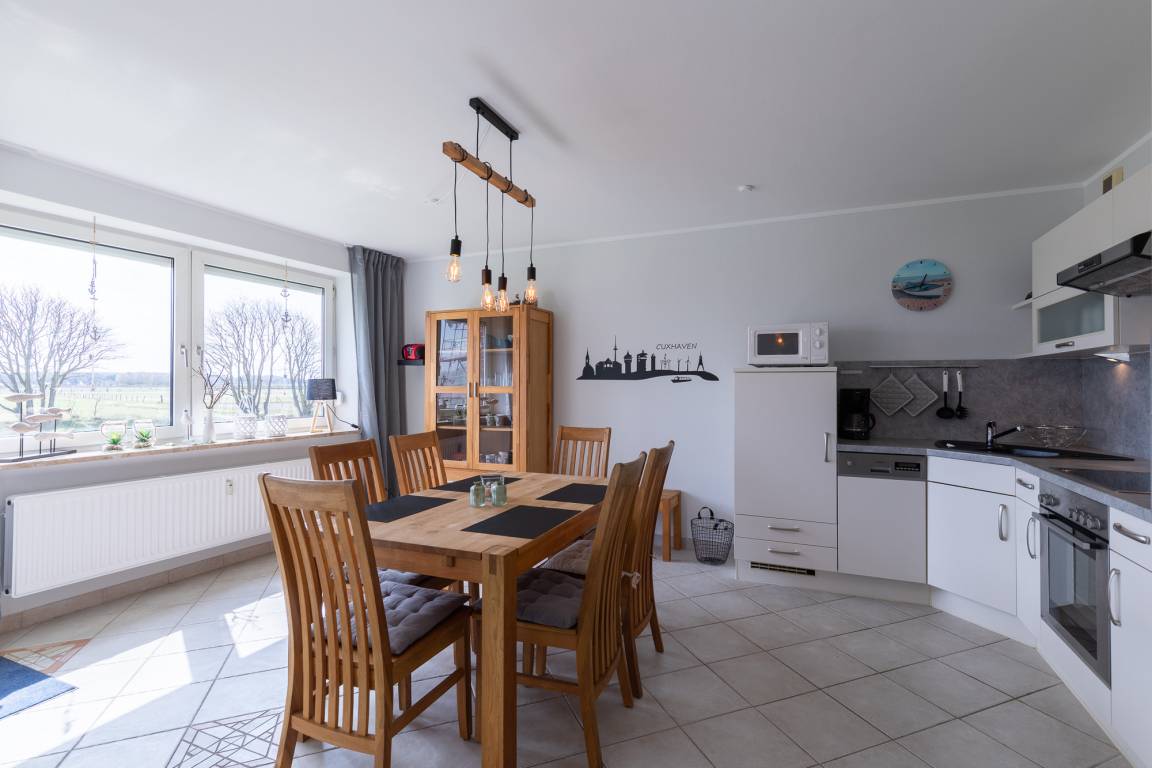 Die 3 Zimmer Wohnung, ca. 76m² ist für bis zu 4 Personen ausgestattet, helles großes Wohnzimmer mit Sofa, TV, Essplatz mit 4 Stühlen und Zugang zum Süd Balkon (mit Gartenmöbel und Blick auf die Duhner Heide), Küchenzeile (Ceranfeld, Backofen, Dunstabzugshaube, Mikrowelle, Geschirrspüler, Kaffeemaschine, Wasserkocher, Toaster), 1 Bad mit Dusche und WC, Flur, die Schlafzimmer befinden sich im Souterrain (an heißen Tagen erwartet Sie hier eine angenehme Kühle und ein gutes Raumklima), 1 Schlafzimmer mit Doppelbett (mit Außenrollo), Kinderbett und Kleiderschrank, 1 Schlafzimmer mit 2 Einzelbetten (mit Außenrollo) und Kleiderschrank, PKW-Stellplatz am Haus, Nichtraucher, es sind keine Tiere erlaubt.