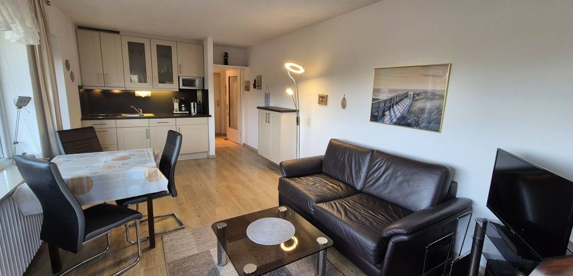 Das Appartement 63 ist ein 2-Raum-Appartement im 5. Obergeschoss für bis zu 4 Personen mit 39 qm. Der möblierte Ostbalkon mit Meerblick bietet morgens Sonne und nachmittags Schatten.
