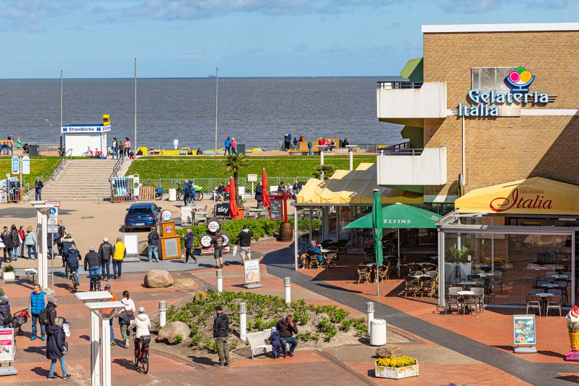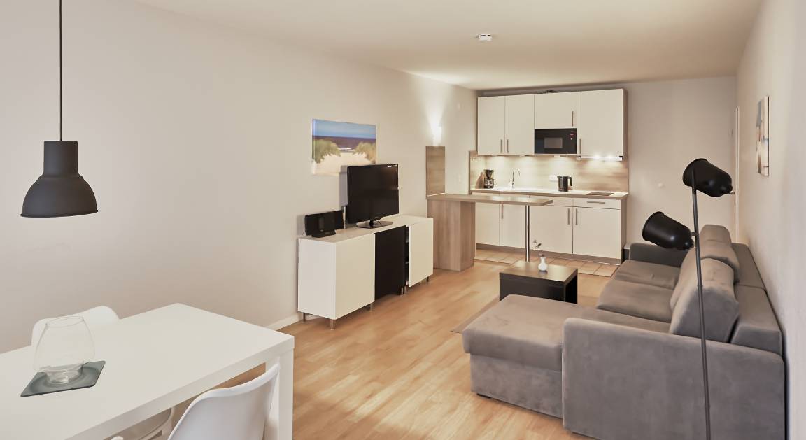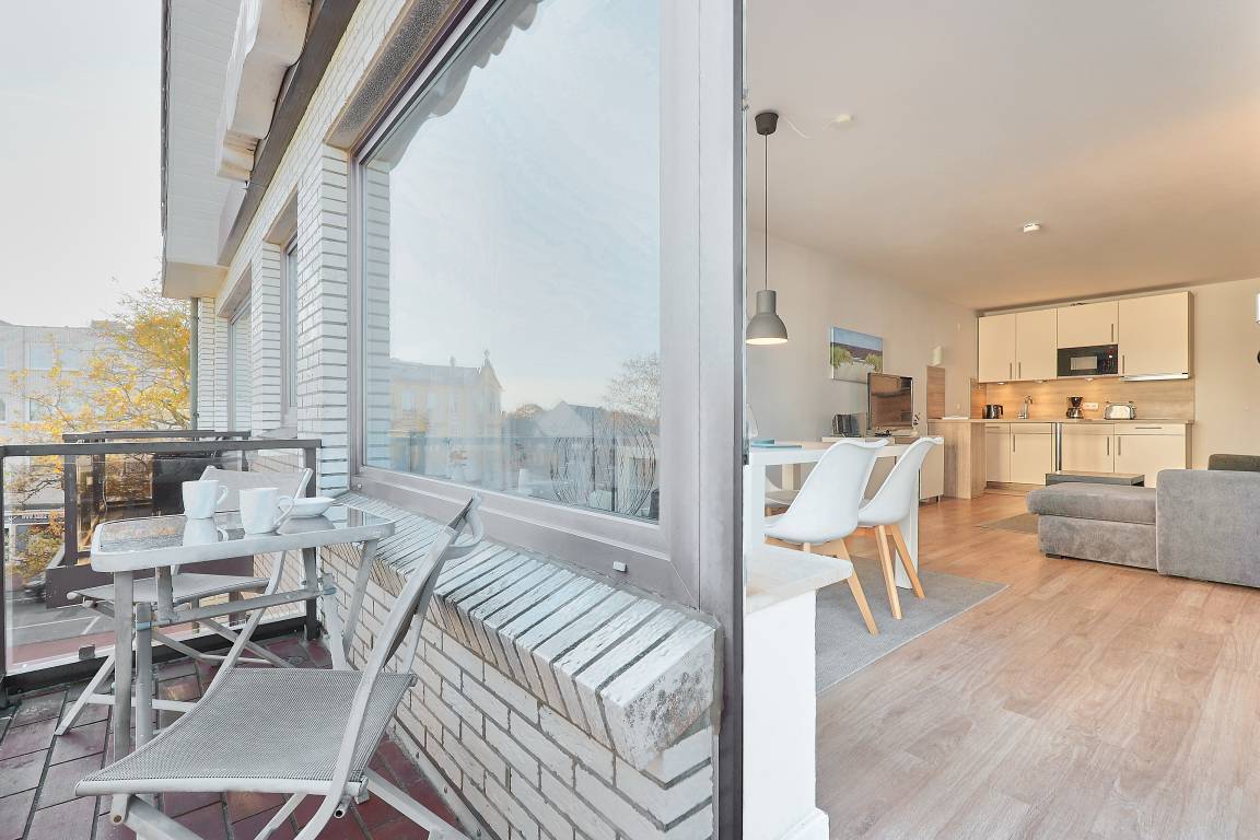 Schöne 2 Raum Ferienwohnung Watt'n Glück im Appartementhaus Düne mit Seeblick für bis zu 4 Personen. Nach erfolgter Modernisierung erwartet Sie eine gepflegte Seeblick Ferienwohnung mit einem Wohn- (mit Flachbildfernseher und verschiedenen Smart Optionen, Musik-Center für iPhone/iPod inkl. CD/Mp3 Player), Ess- und Schlafbereich (hochwertige Schlafcouch mit integrierter 140x200cm Matratze und Bettkasten). Hier befindet sich auch die integrierte Küchenzeile, mit Geschirrspüler und einem Tresen für den schnellen Kaffee zwischendurch. Ein separater Schlafbereich bietet Platz für 2 weitere Personen. Vom Balkon aus dem 2. OG des Hauses "Appartementhaus Düne" haben Sie eine schöne Sicht auf den Dorfbrunnenplatz und die Nordsee.
