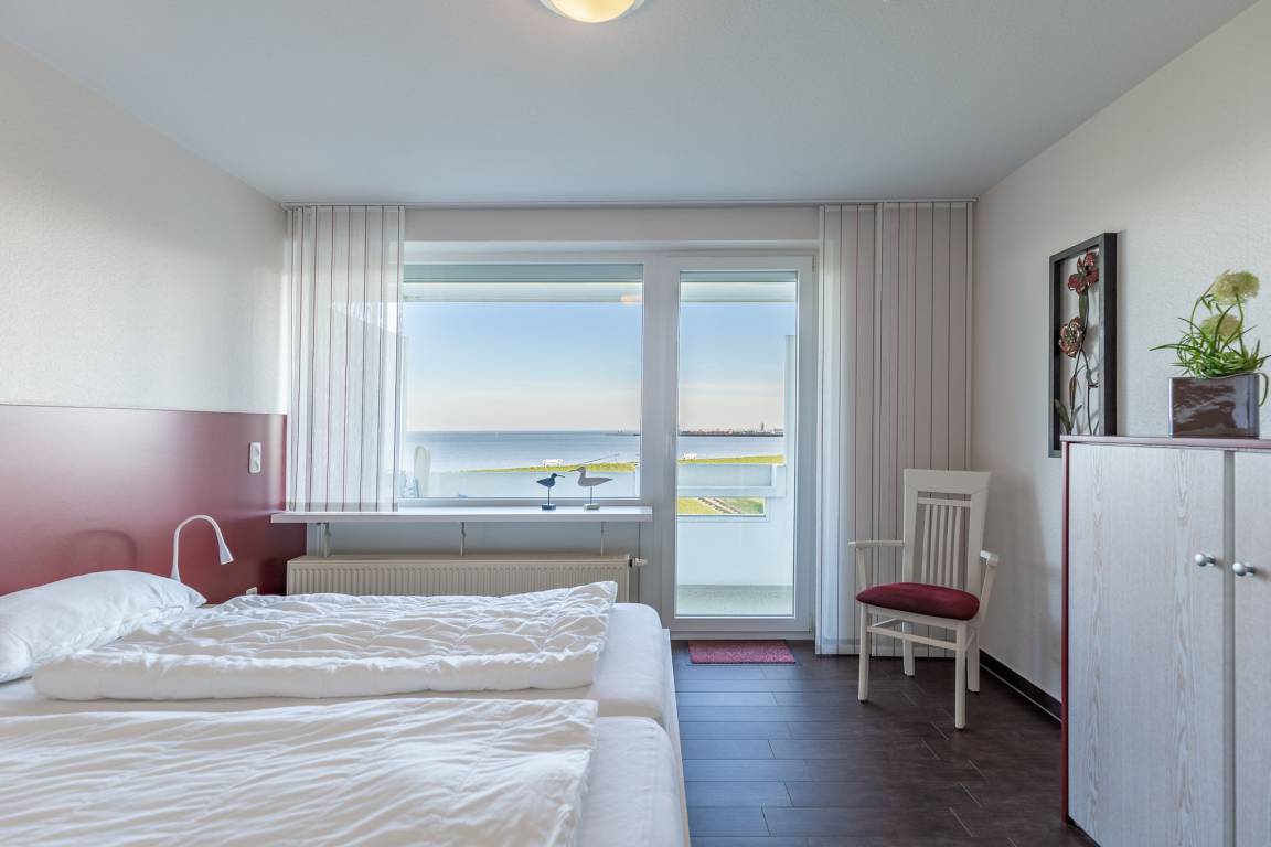 Schiffchen anstatt Schäfchen zählen. Morgens wachen Sie auf und sehen das Meer. Dafür müssen Sie noch nicht einmal aus Ihrem Bett aufstehen. Die 2-Zimmer Ferienwohnung bietet im separaten Schlafzimmer ein Doppelbett (2x90x200) mit rückenschonender Komfortliegehöhe, hochwertigen Matratzen und spektakulärem Meerblick. Genießen Sie schon beim Aufstehen den atemberaubenden Meerblick. Alle Fenster sind mit elektrischen Außenjalousien ausgestattet, so dass Sie nicht von der Morgensonne geweckt werden.