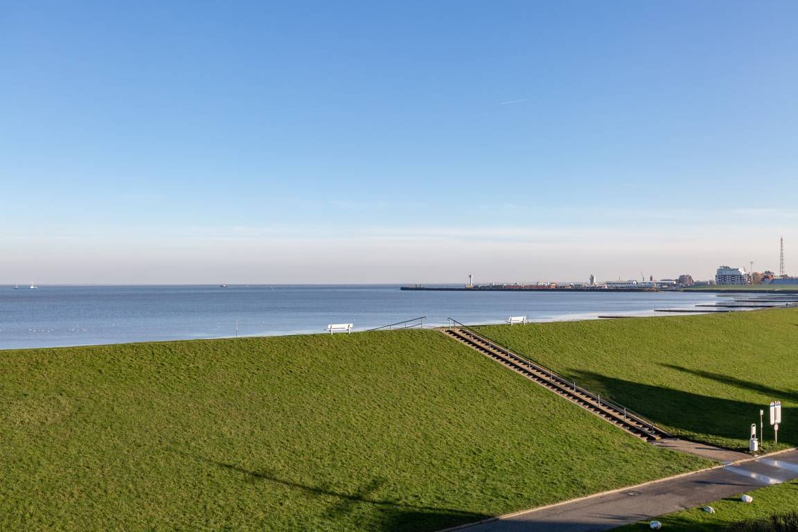Vom Esstisch am Fenster genießen Sie schon beim Frühstück den atemberaubenden Ausblick auf die vorbeifahrenden Krabbenkutter, Segelschiffe und Luxus Liner, die zum Greifen nah scheinen. Ein großer Metz LCD-TV sorgt auch an einem Fernsehabend für beste Unterhaltung. Die separate Küche ist mit einem 2 Plattenherd, einem Geschirrspüler sowie einem Kühlschrank mit Gefrierfach ausgestattet. Eine Rarität ist der großzügige Balkon mit spektakulärem Meerblick, der bei sonnigem Wetter zum Verweilen einlädt. Zur Ferienwohnung gehört ein modernes Bad mit Dusche und WC.