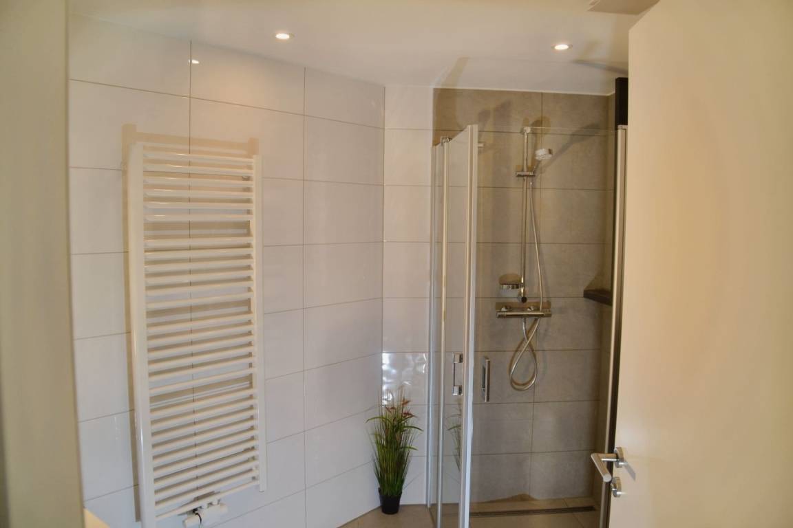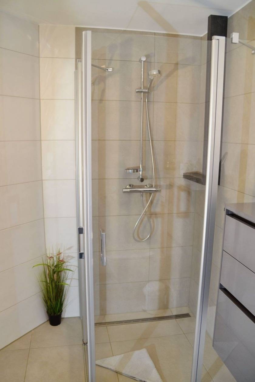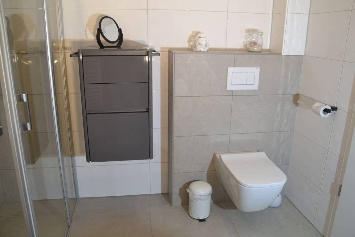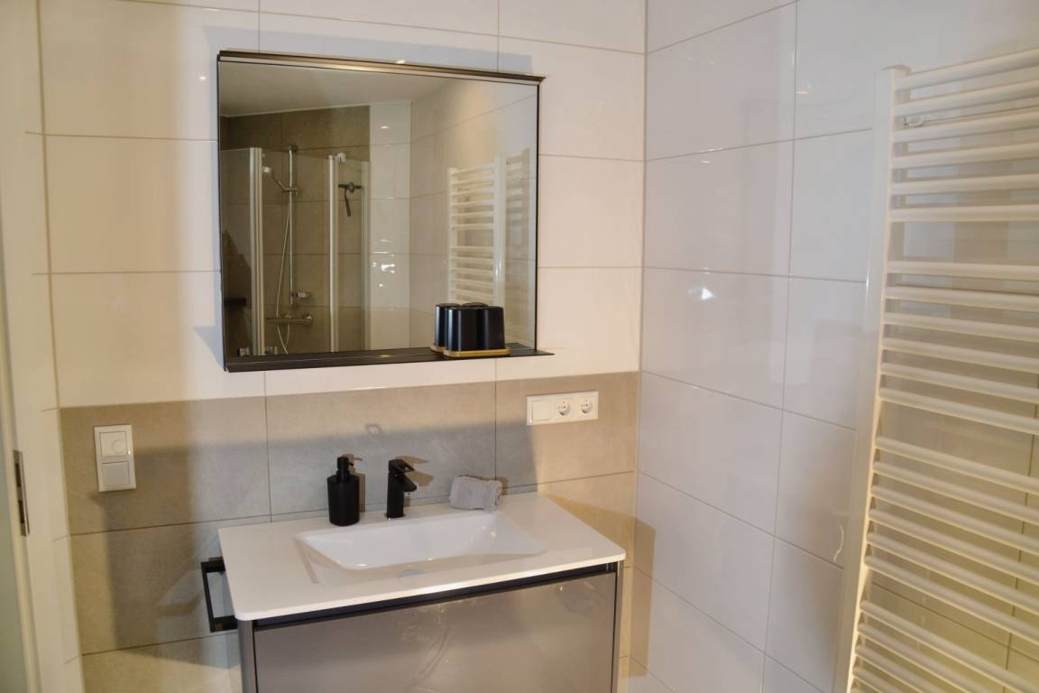 Das geschmackvoll eingerichtete Schlafzimmer ist mit einem komfortablen Doppelbett und einem Smart-TV ausgestattet und verspricht ruhige Nächte. Die elektronischen Außenrollos sorgen für Privatsphäre und eine angenehme Dunkelheit zum Schlafen. Das moderne Badezimmer mit Dusche rundet das Angebot ab und bietet zusätzlichen Komfort.