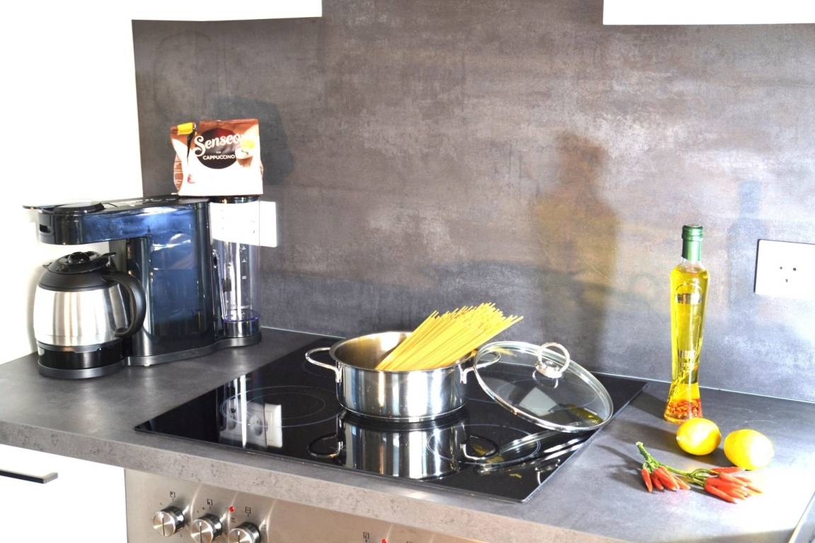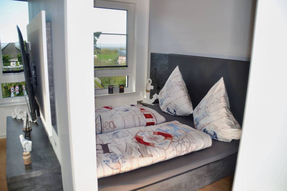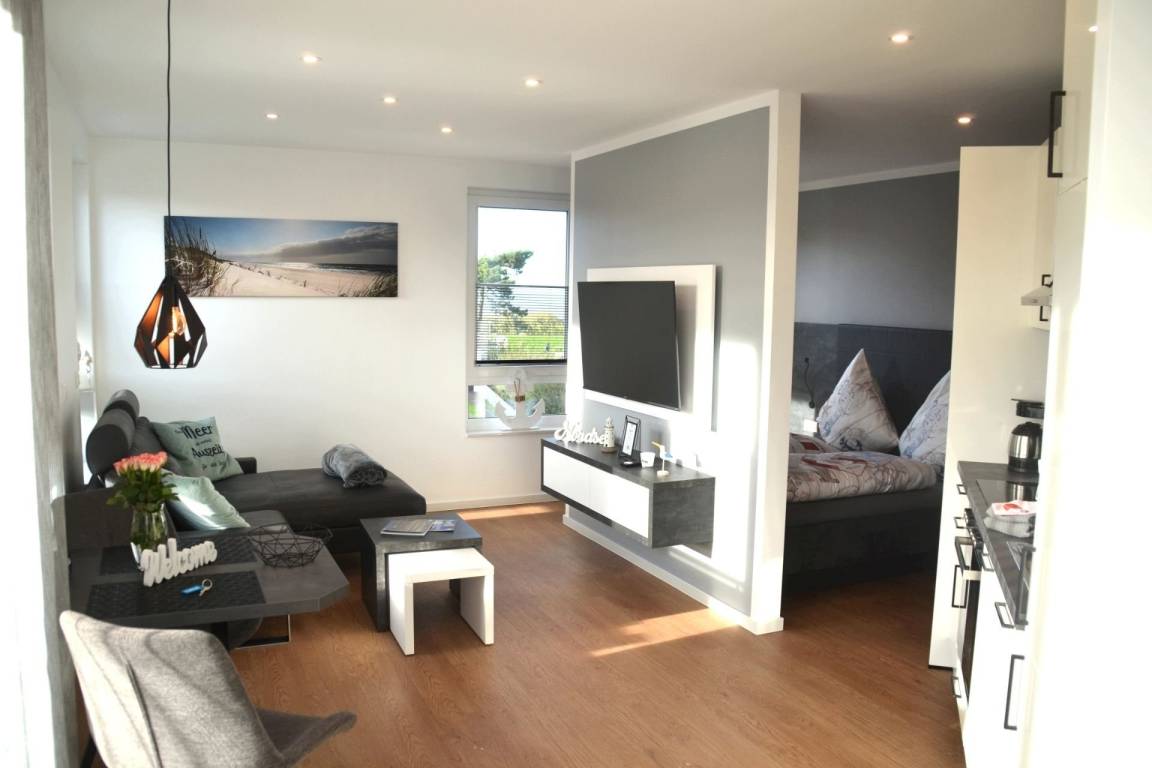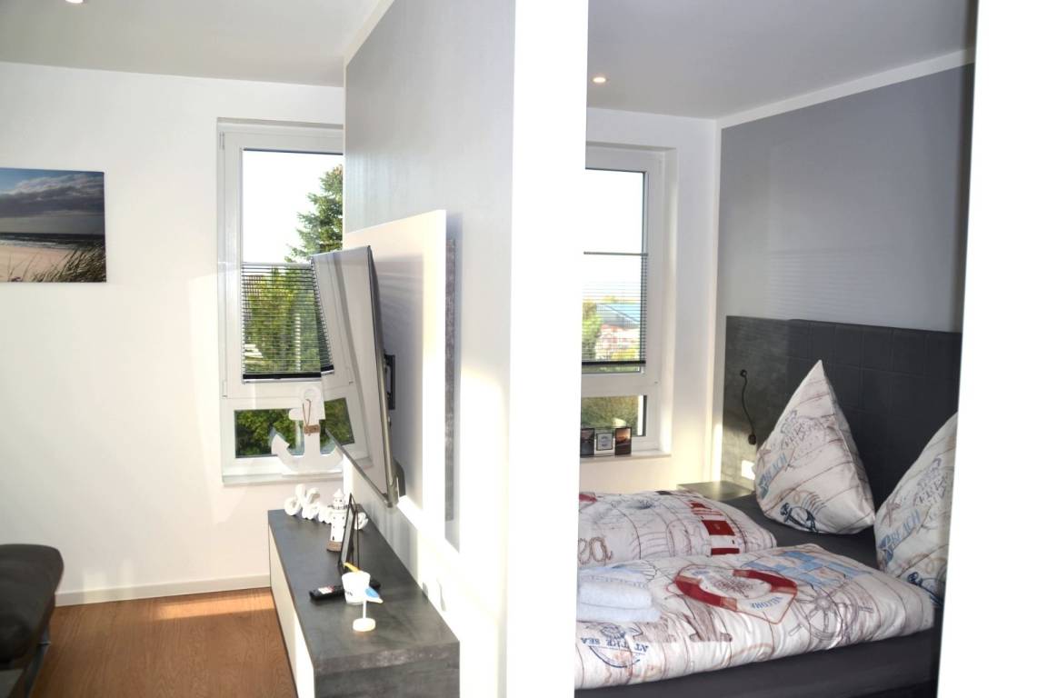Das große, offen gestaltete Zimmer verbindet Wohnen, Schlafen, Kochen und Essen harmonisch miteinander und bietet nach einem Tag am nahegelegenen Sandstrand von Cuxhaven Duhnen den idealen Rahmen, um den Abend ausklingen zu lassen. Während Ihr Abendessen in der vollausgestatteten Küchenzeile köchelt, können Sie sich bereits auf der Couch entspannen oder den Esstisch decken.