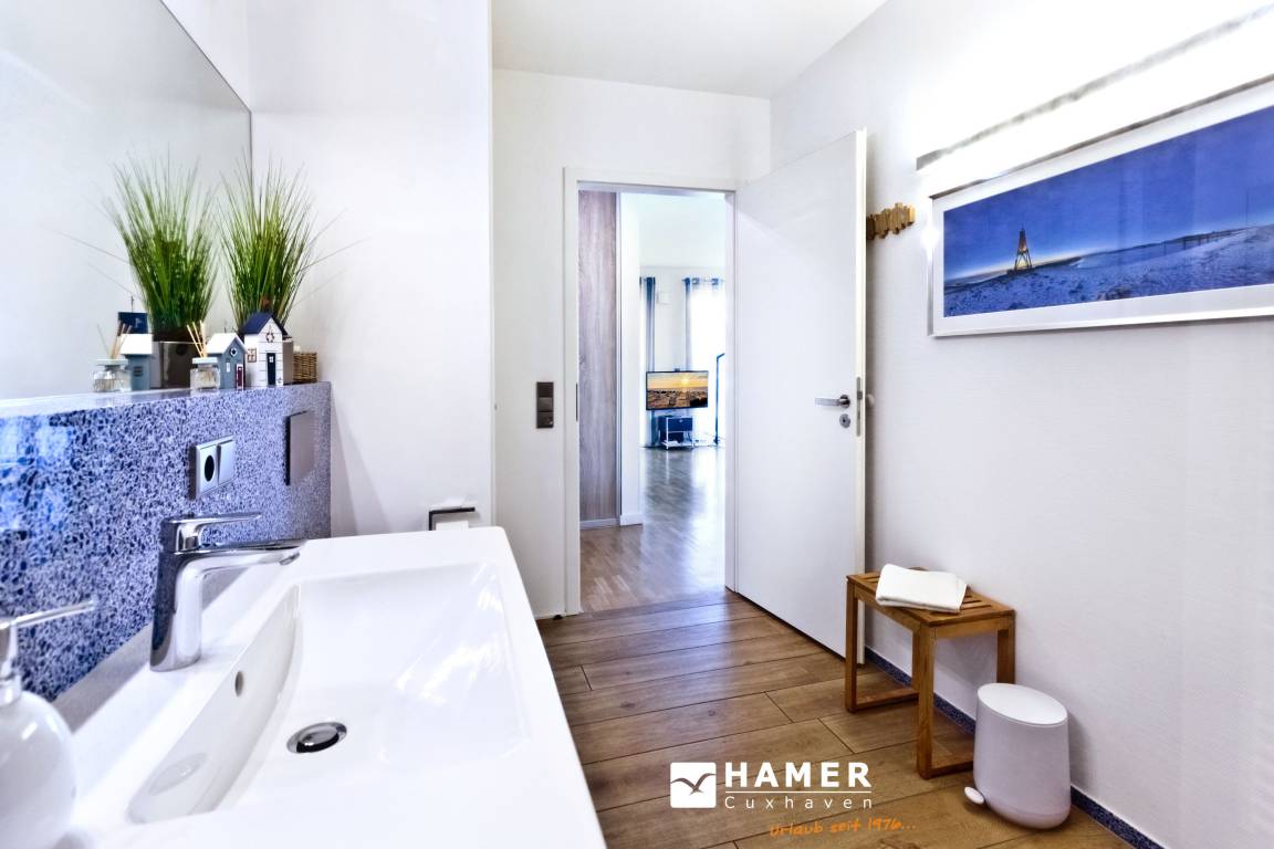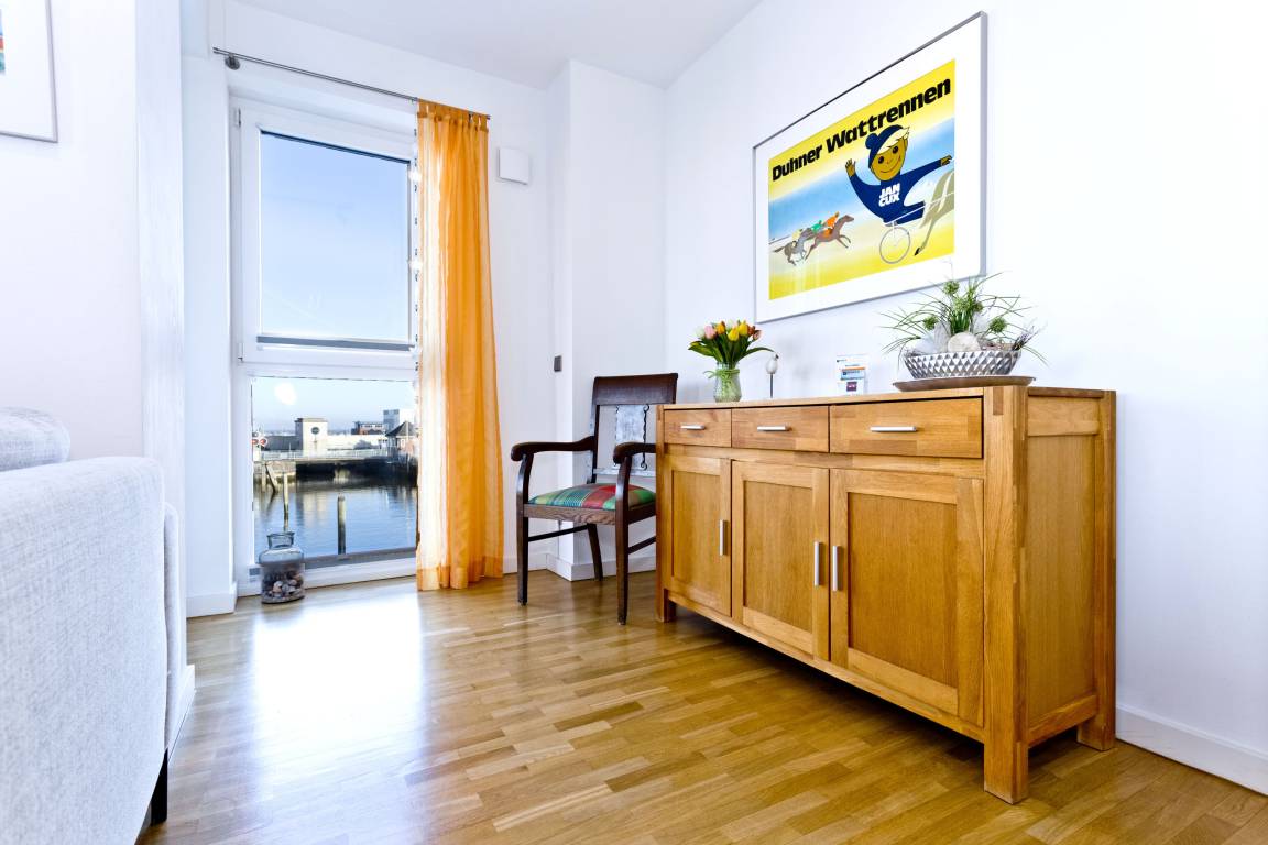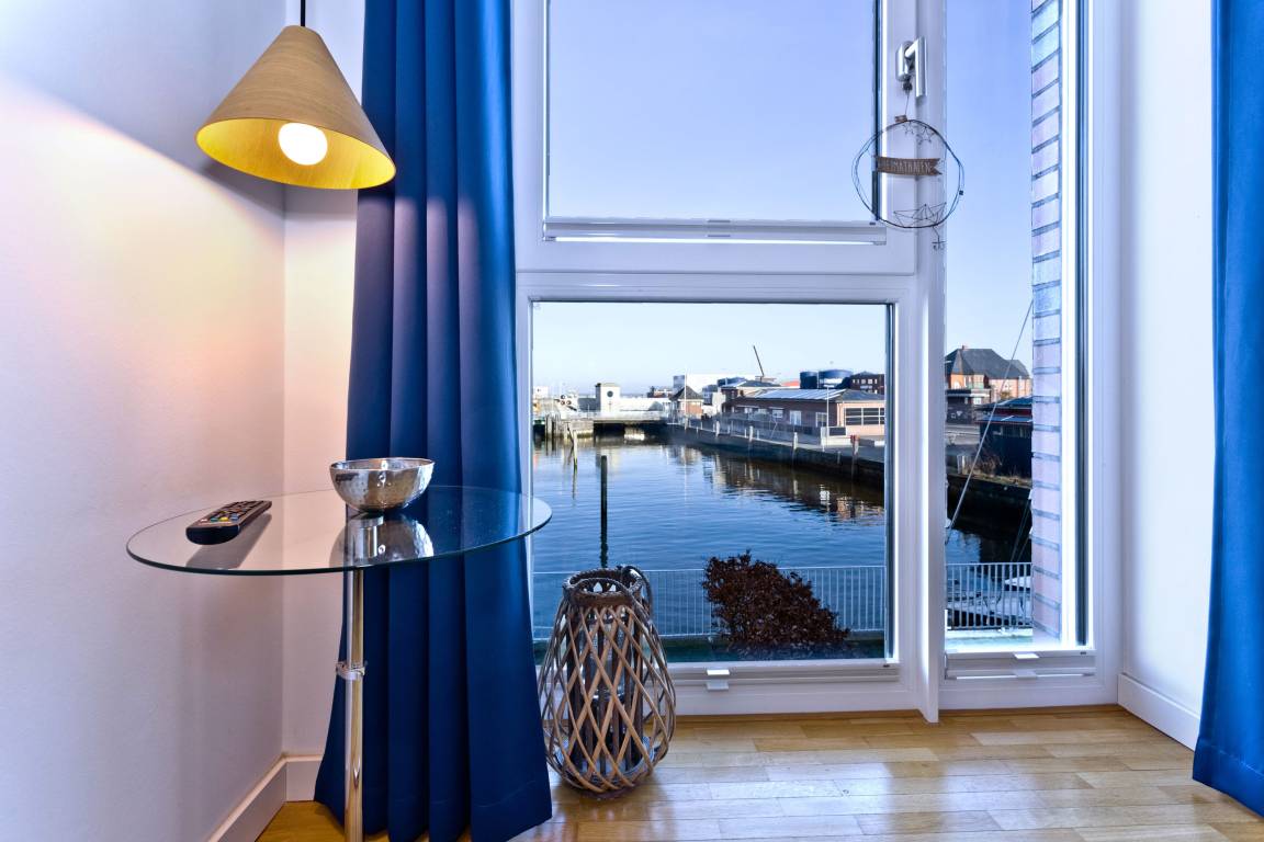 Direkt an der Marina Cuxhaven gelegene Neubauwohnung über ca. 80m². Tolle 2 Zi. Luxus-Wohnung in der 1. Etage mit Seesicht für max. 2Pers. ausgestattet, großzügiges Wohnzimmer mit großem Balkon (nord/west). Dieser Balkon wird in den Wintermonaten teilweise zur Loggia umgebaut. Vollständig ausgestattete Küchenzeile, 1 Schlafzimmer mit Doppelbetten, alle Räume sind über elektr. Außenjalousien zu verdunkeln (Wohnraum teilweise), 2xTV, Radio/CD, kostenloses W-Lan-Internet, ebenerdige Dusche/WC, reservierter Pkw-Stellplatz in der Tiefgarage #49, Nichtraucher und es sind keine Haustiere gestattet.