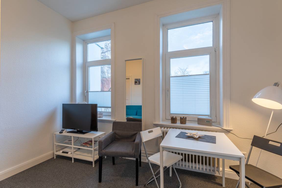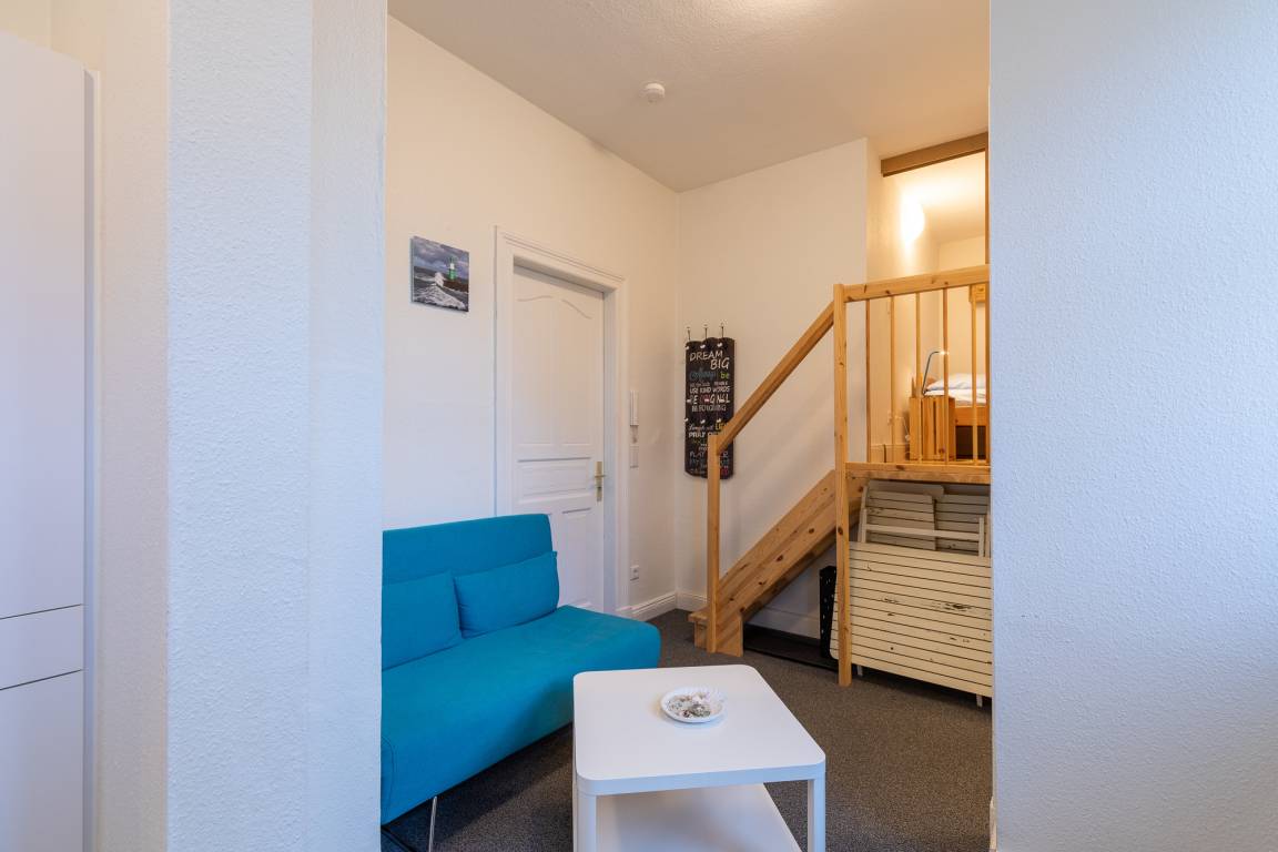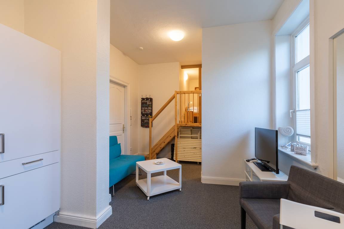 Die Ferienwohnung 1 mit einer Größe von ca. 38 m² ist komplett bis zu 3 Personen ausgestattet. 1 Schlafzimmer mit Doppelbett, Kleiderschrank und Zugang zum Balkon, Wohnzimmer mit Einbauküche (Backofen, Cerankochfeld, Geschirrspüler, Kühlschrank), Essecke, Sofa und Zugang (Treppe) zum 2. Schlafzimmer mit einem Einzelbett, 1xDusche mit WC, 1 Flatscreen TV im Wohnzimmer, Nichtraucherwohnung, keine Haustiere, der PKW-Stellplatz kann am Strichweg, vor dem Haus, geparkt werden.