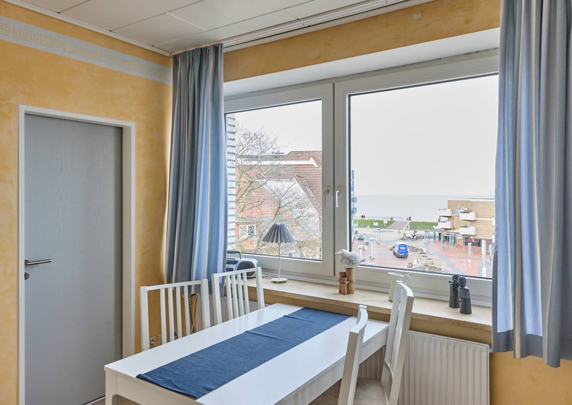 Das großzügige Fenster zur Nordseite eröffnet einen lebendigen Blick auf die Fußgängerzone Strandstraße, die Nordsee und die vorbeiziehenden Schiffe auf der Elbe. Von der gemütlichen Couchgarnitur ebenso wie vom Essbereich aus lässt sich dieses maritime Panorama entspannt genießen – ein Ausblick, der zu jeder Tageszeit Abwechslung bietet.