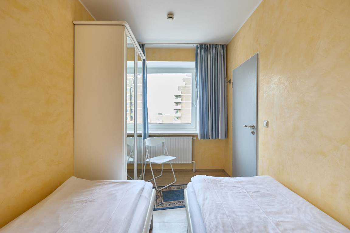 Im Schlafzimmer erwarten Sie zwei Einzelbetten, die bei Bedarf zu einem Doppelbett zusammengestellt werden können. Ein geräumiger Kleiderschrank – teilweise komplett verspiegelt – bietet ausreichend Stauraum für Ihre Urlaubsgarderobe. Leselampen über den Betten sorgen für zusätzlichen Komfort und eine angenehme Atmosphäre am Abend.