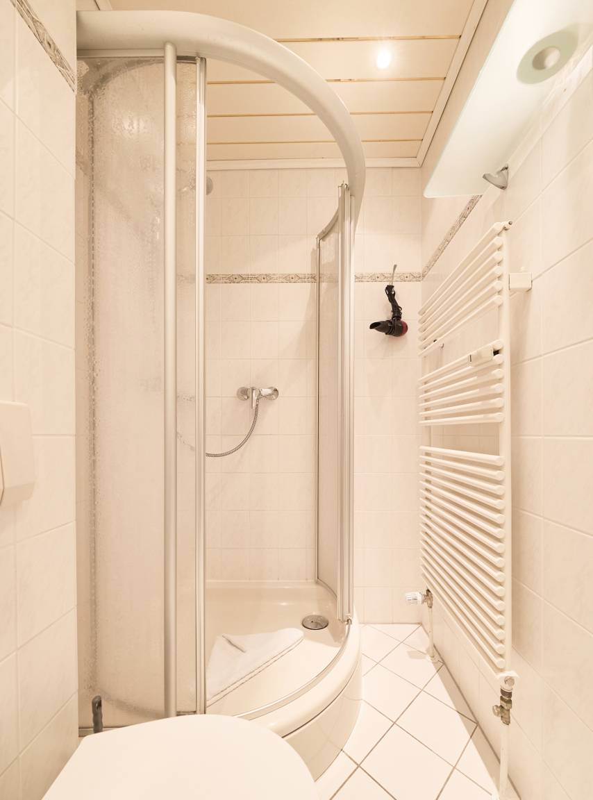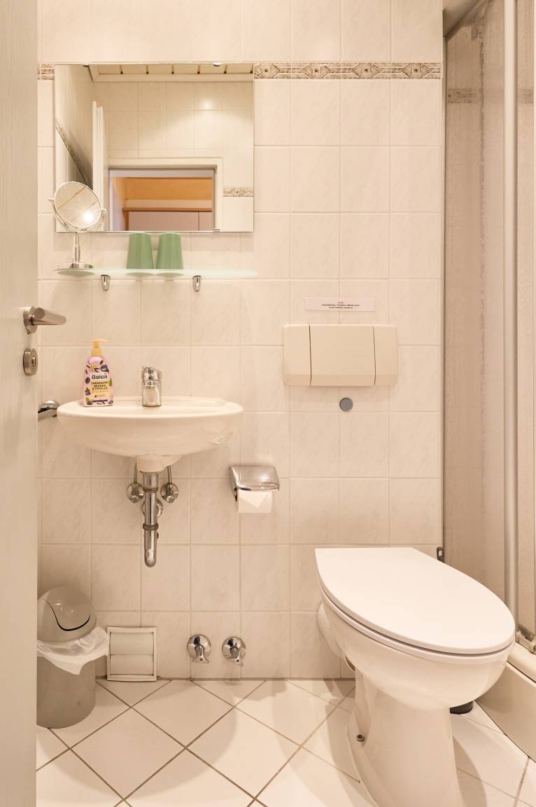 Das Badezimmer ist mit Dusche, WC und Handwaschbecken ausgestattet und funktional gestaltet. Die Ferienwohnung eignet sich gut für Senioren sowie für Einzelpersonen.