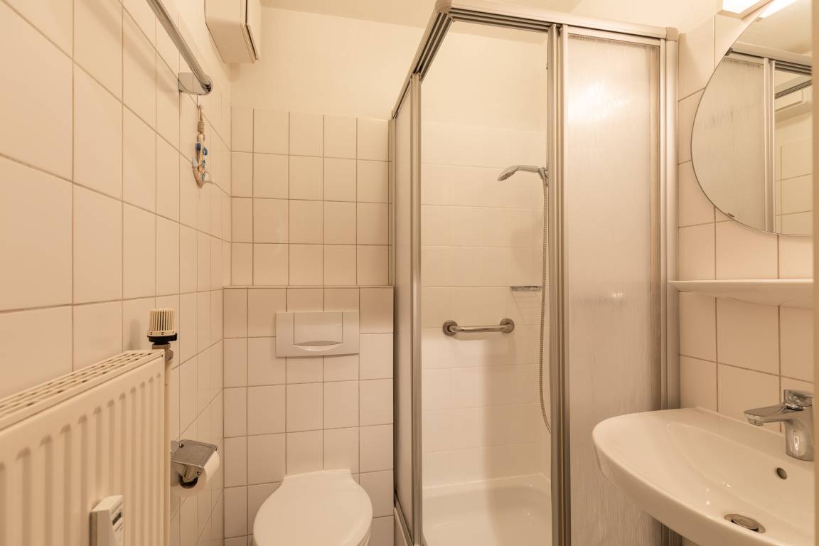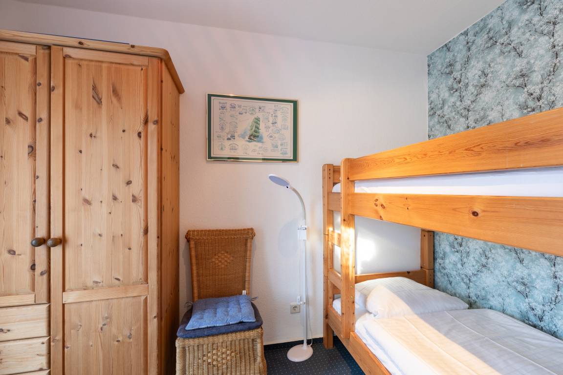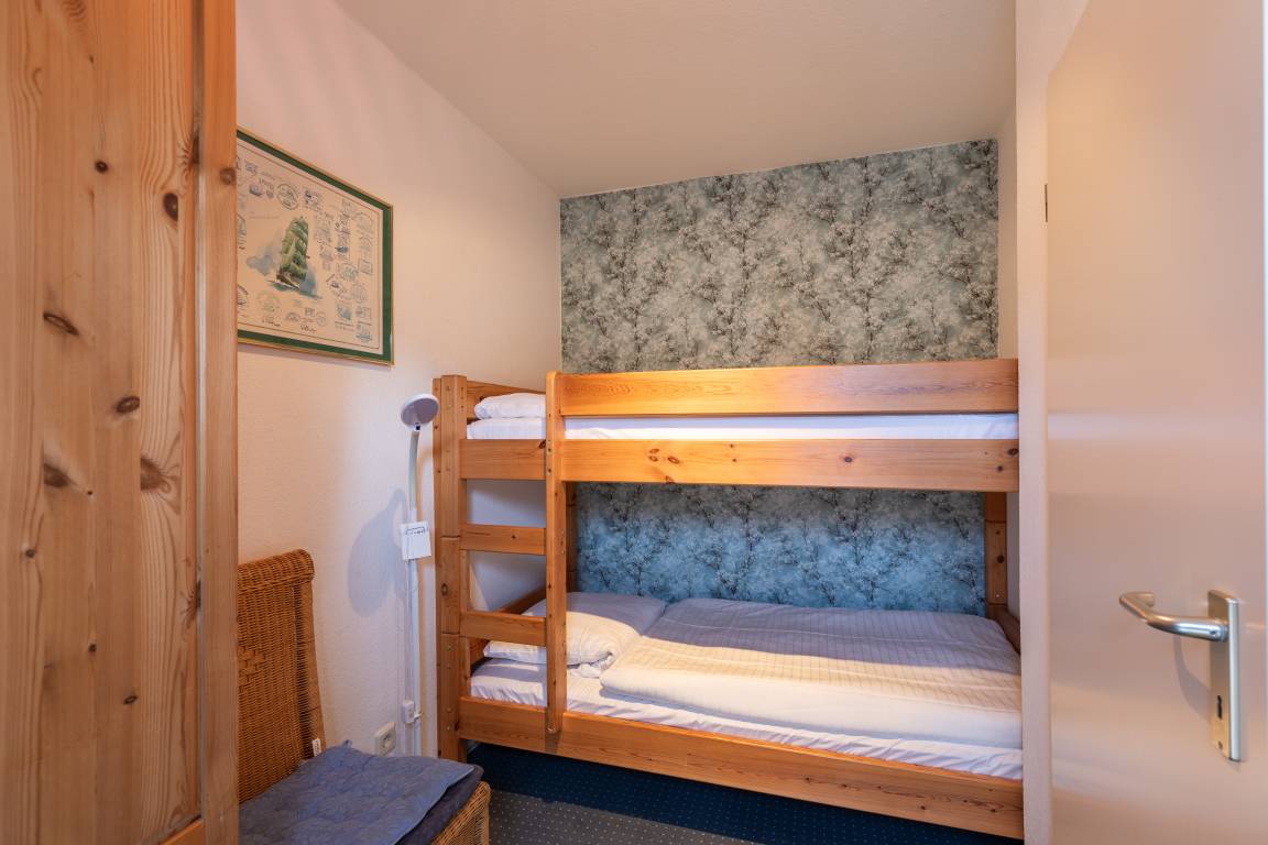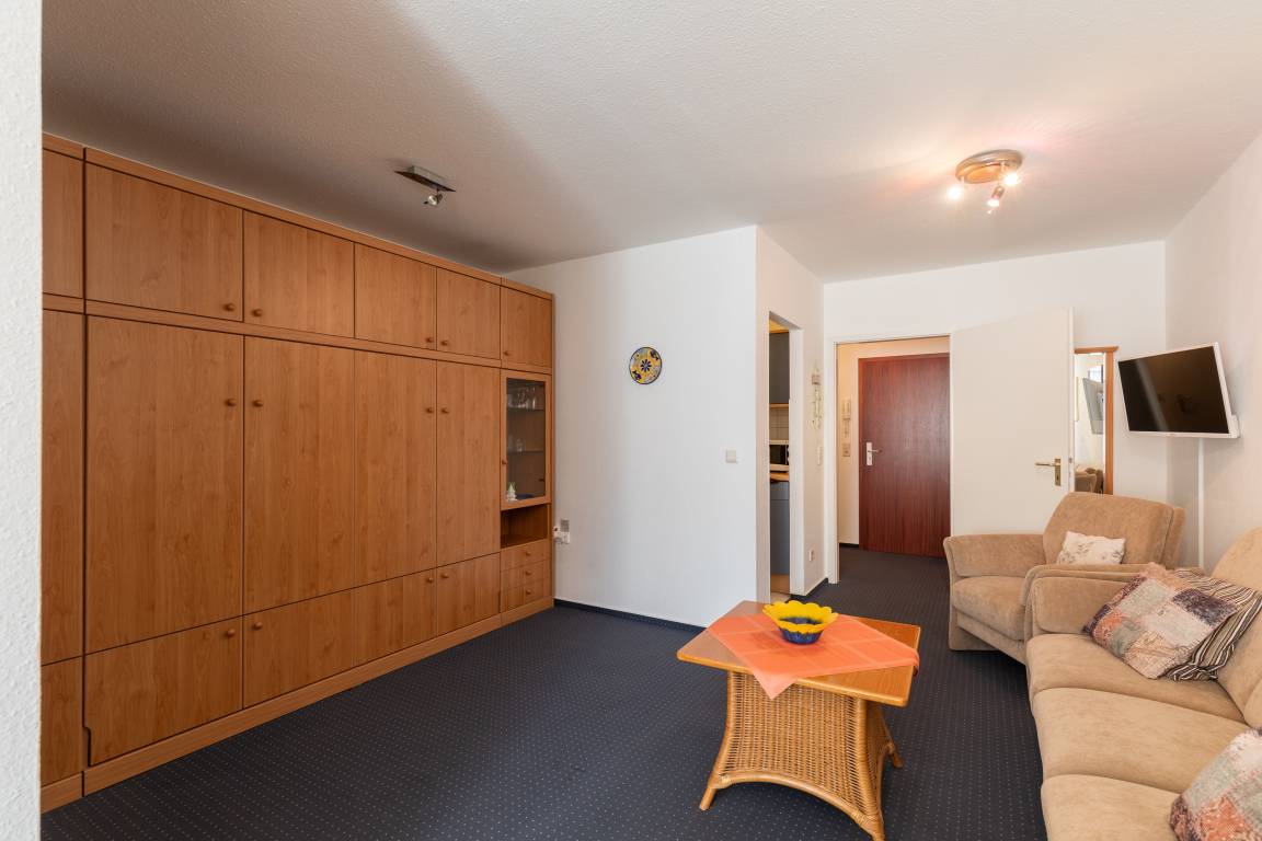 Die Ferienwohnung mit einer Größe von ca. 45m² Wohnfläche ist komplett bis zu 4 Personen ausgestattet. 1 Wohnzimmer mit 2 Schrankbetten, einem Essplatz am Fenster, Sofa, Sessel und 1 Flachbildfernseher. separate kleine Küche mit 4 Plattenherd, Backofen, Kühlschrank, Kaffeemaschine, Wasserkocher, Mikrowelle und Toaster),1 Schlafzimmer mit Etagenbett und Schrank, 1 Abstellraum, Flur, Bad mit Dusche, WC, Waschbecken und Spiegel, Nichtraucherwohnung, keine Haustiere, Tiefgaragenstellplatz im Nachbarhaus.