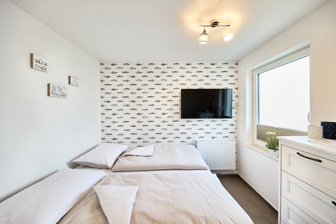 Schlafzimmer mit komfortablem Boxspringbett (180×200 cm) und zusätzlichem Flachbild-TV