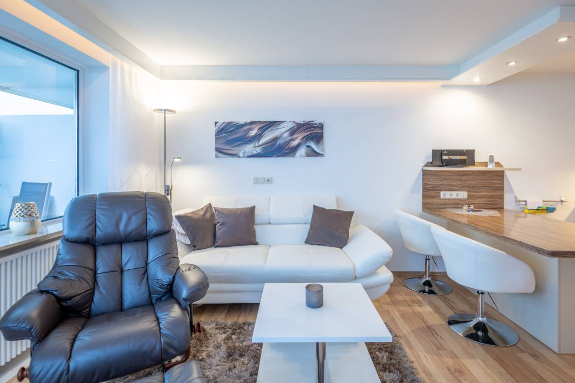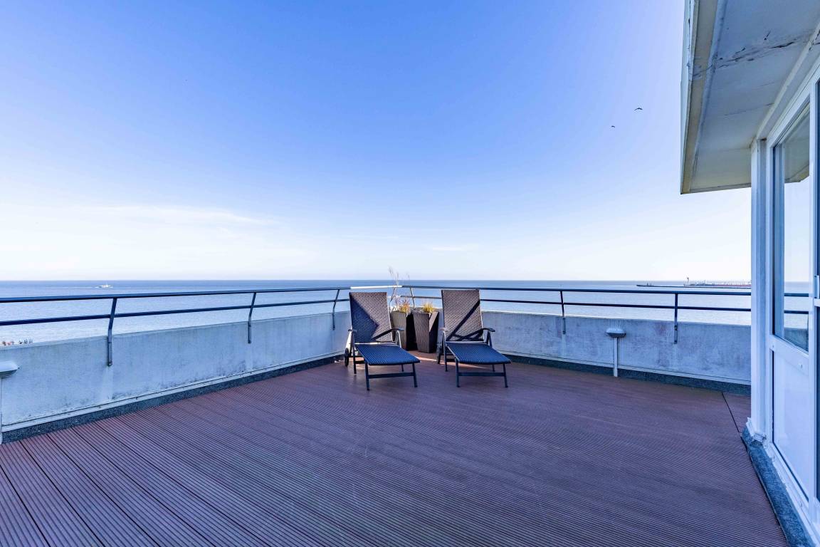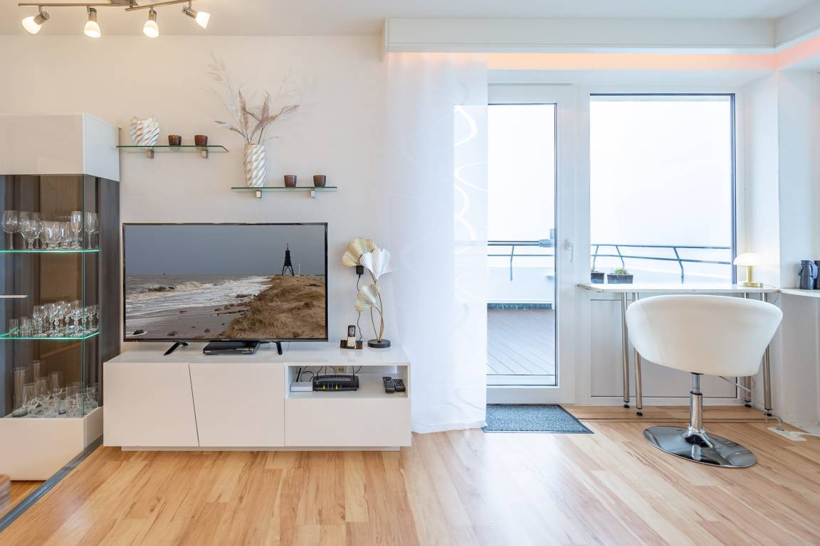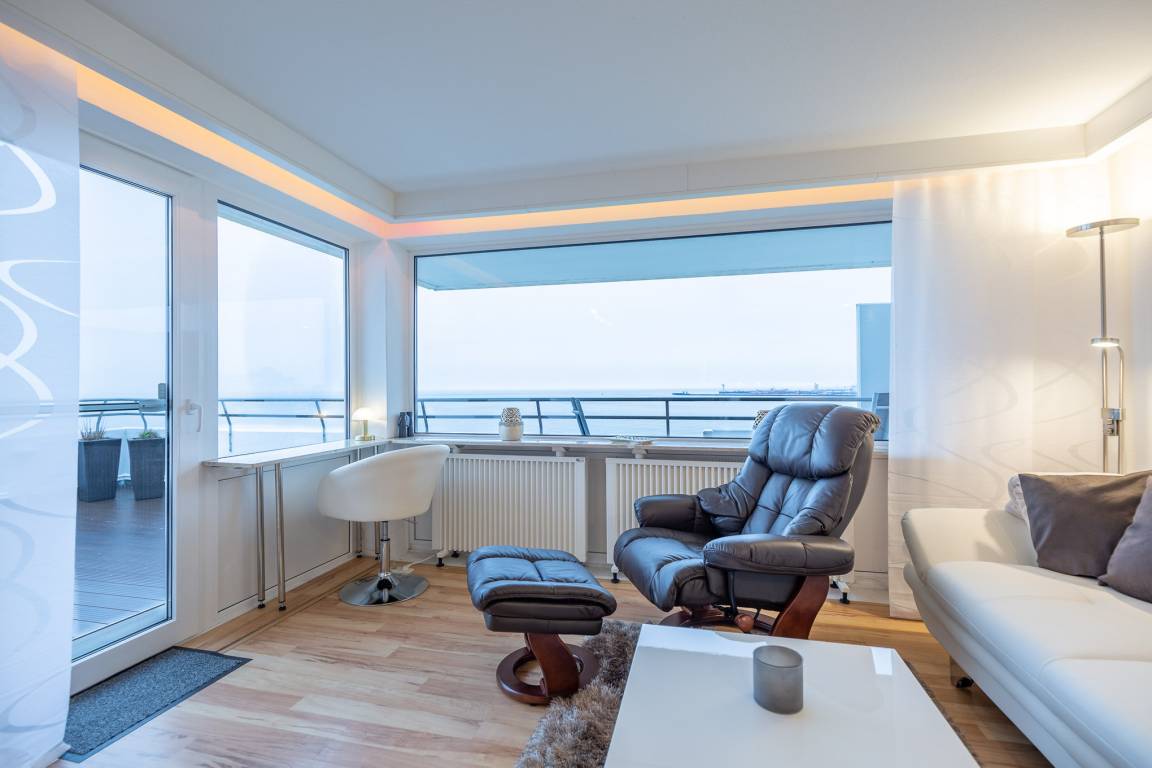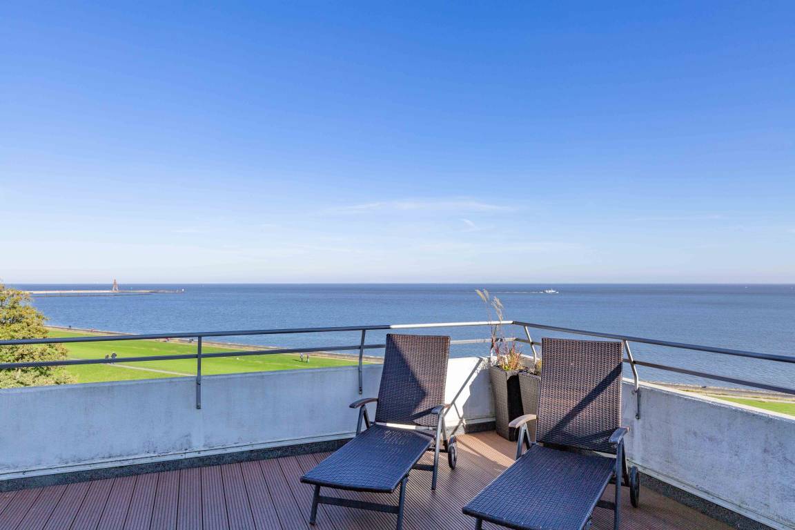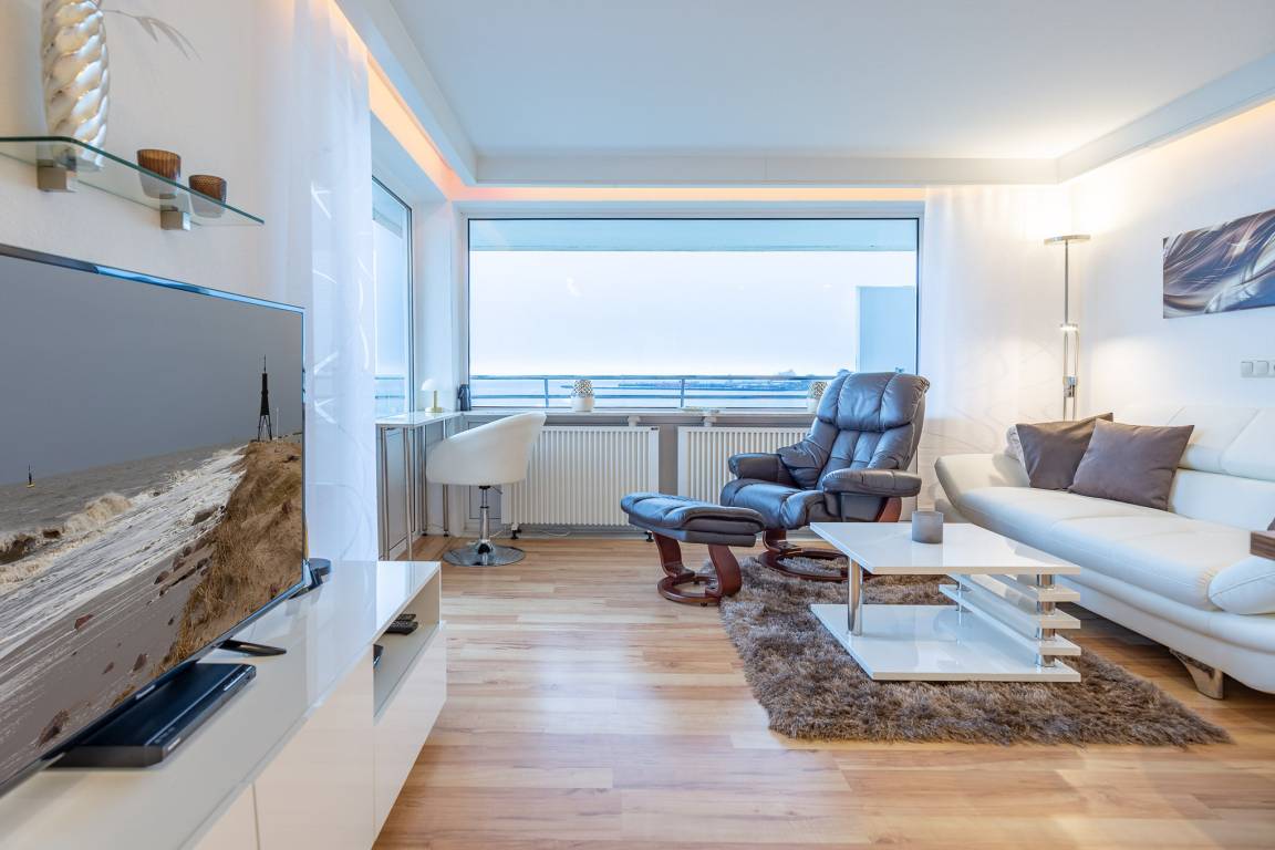 Die erhöhte Sitzecke mit gemütlichem Sofa und Relax Sessel am Fenster bietet Ihnen einen atemberaubenden Ausblick auf die vorbeifahrenden Krabbenkutter, Segelschiffe und Luxus Liner, die zum Greifen nah scheinen. Ein absolutes Highlight dieser Wohnung ist die sehr große Terrasse mit spektakulärem Meerblick, die Sie sowohl vom Wohnzimmer wie auch vom Schlafzimmer betreten können. Die offene Küche mit Backofen, Ceranfeld und Geschirrspüler bietet Hobbyköchen die Möglichkeit der Selbstversorgung. Die Sonnenstunden können Sie entspannt auf den Liegestühlen auf der Terrasse verbringen. Ein Flachbildfernseher sorgt dafür, dass Sie auch im Urlaub nicht auf Ihre Lieblingsserie verzichten müssen.