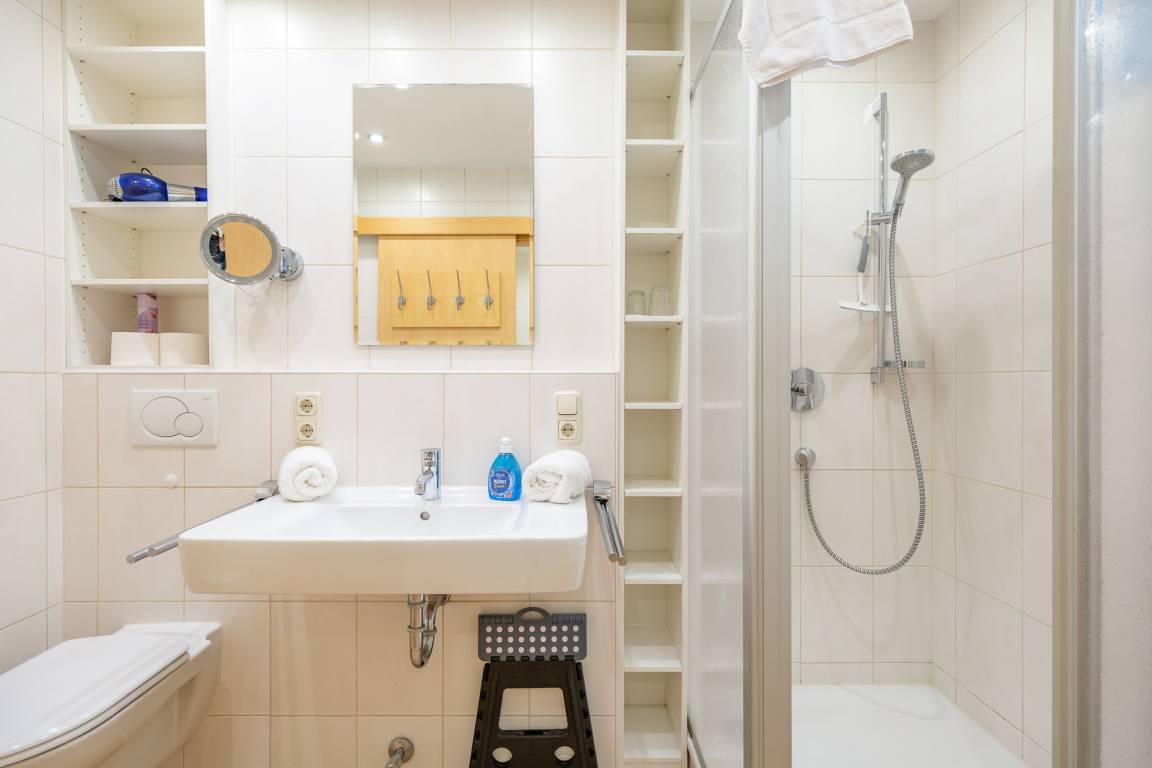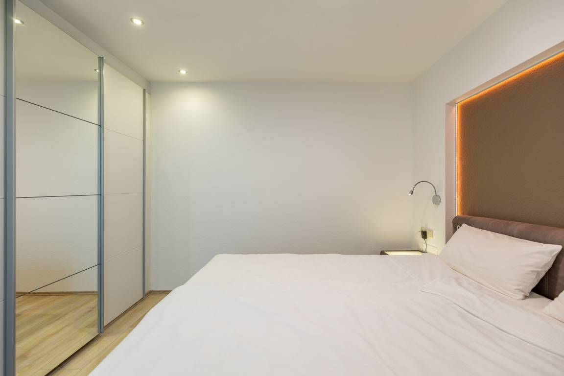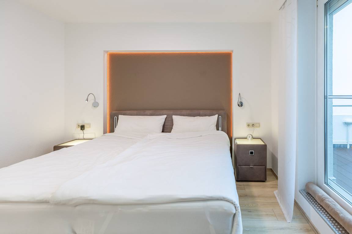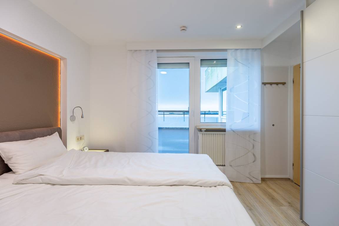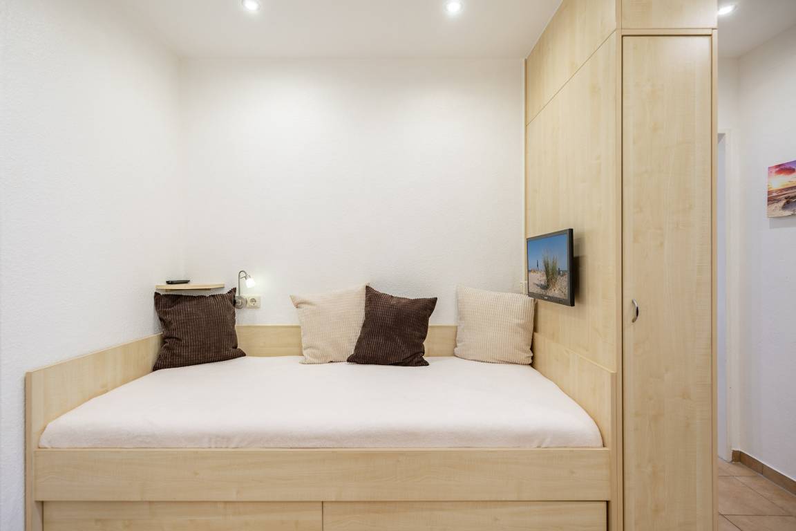Das separate Schlafzimmer samt Boxspringbett (2x90x200) mit rückenschonender Komfortliegehöhe gewährleistet einen erholsamen Schlaf. Elektrische Außenjalousien sorgen dafür, dass Sie nicht von der Morgensonne geweckt werden. In einem dritten Bett (90×200) im Eingangsbereich kann eine weitere Person schlafen. Dank zweitem Fernseher ist auch getrenntes fernsehen möglich. Zur Ferienwohnung gehört ein modernes Bad mit Dusche, WC und Fenster zum belüften.