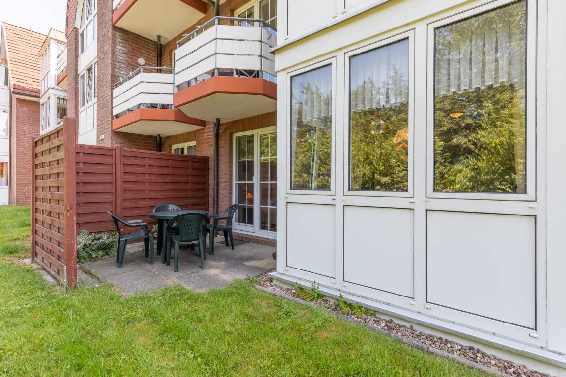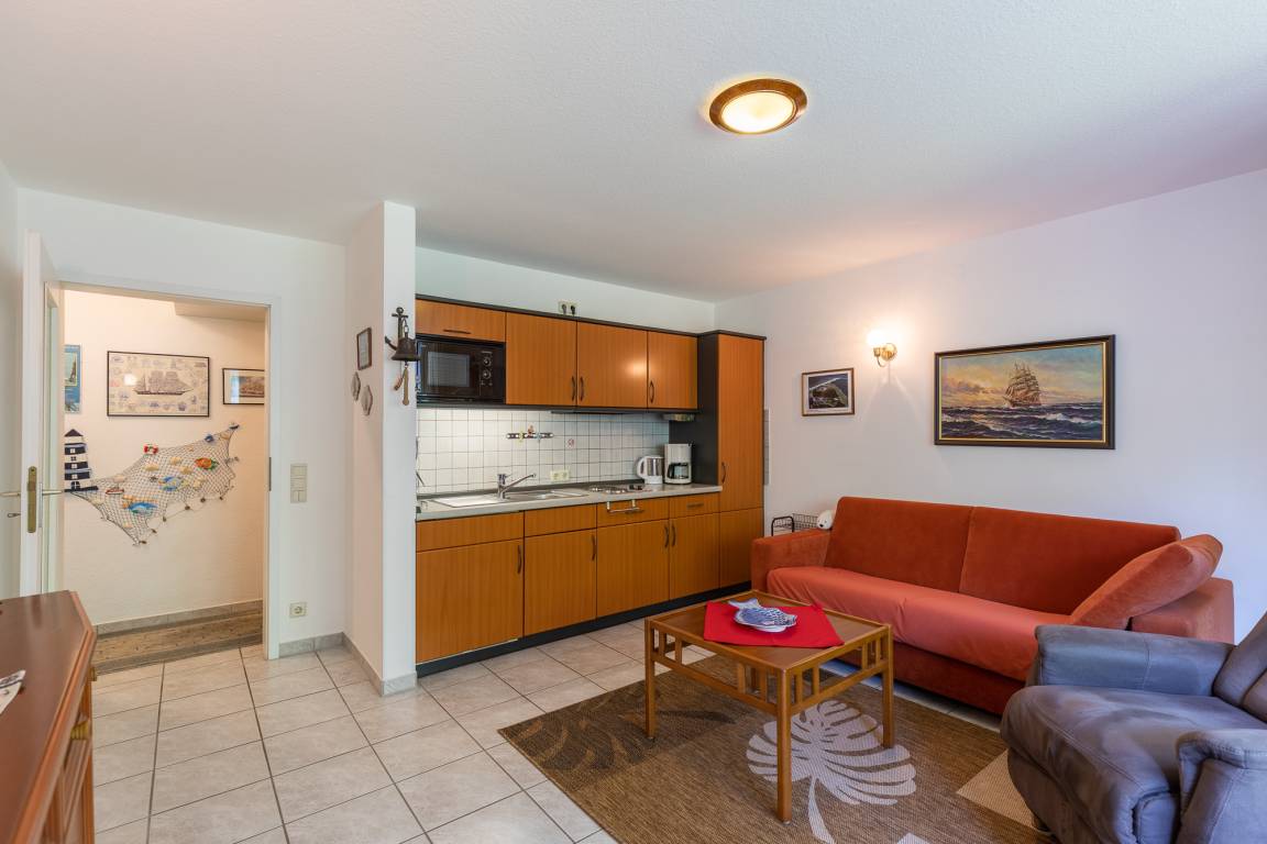 Die Wohnung 8 ist eine Ferienwohnung mit einer Größe von ca. 50 m² Wohnfläche und komplett bis zu 2 Personen ausgestattet. Das Wohnzimmer verfügt über eine Küchenzeile (Mikrowelle, 2 Plattenherd, Kühlschrank), eine gemütliche Sitzecke mit Sofa und Sessel. Der Essplatz bietet Platz für bis zu 4 Personen, mit Blick in das Grüne, das Schlafzimmer verfügt über ein Doppelbett, einen Kleiderschrank und den Zugang zur Terrasse, das innenliegende Bad ist mit einer Dusche, einem WC und Waschbecken ausgestattet, Nichtraucherhaus, keine Haustiere, kostenloser PKW-Stellplatz direkt am Haus in der Tiefgarage.