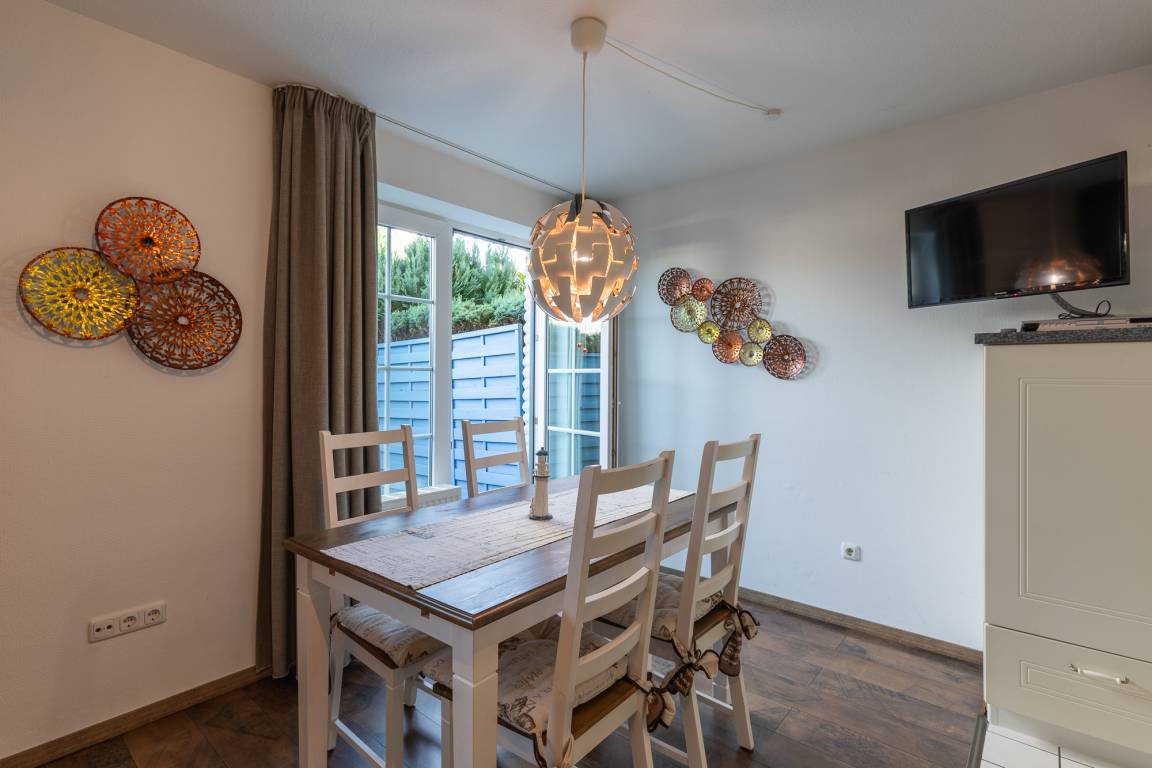 Die modern eingerichtete Wohnung mit einer Größe von ca. 58 m² Wohnfläche ist komplett bis zu 4 Personen ausgestattet. 1 Schlafzimmer mit Doppelbett (1,40m x 2,00m), großes Wohnzimmer mit Einbauküche (Cerankochfeld, Mikrowelle, Kühlschrank mit Gefrierfach), Essplatz, Sofa-Ecke (als Schlafsofa nutzbar), TV und direktem Zugang zur Terrasse (4 Korb Stühle, Tisch und Sonnenschirm), 1xDusche mit WC, 1 Flatscreen TV (Wohnzimmer), Abstellraum, Flur, Nichtraucherwohnung, keine Haustiere, PKW-Stellplatz direkt am Haus.