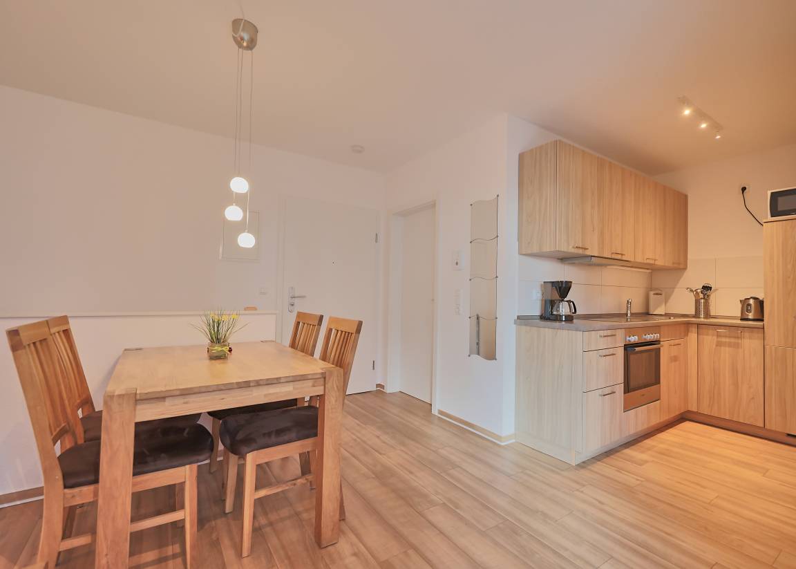 Der helle Wohnbereich im Erdgeschoss ist mit einer gemütlichen Eckcouch und einem Essplatz ausgestattet und bietet einen angenehmen Raum für gemeinsame Stunden. Von hier aus gelangen Sie direkt auf die Südterrasse, die sich besonders für Frühstück im Freien oder entspannte Nachmittage eignet. Die angrenzende Küche ist komfortabel eingerichtet und unter anderem mit einem Geschirrspüler ausgestattet.