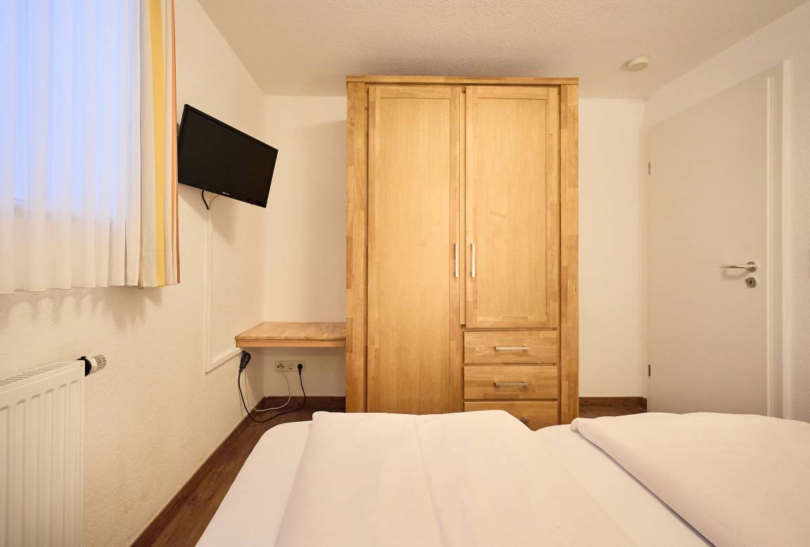 Im Erdgeschoss befindet sich ein Schlafbereich mit Etagenbett – besonders geeignet für Kinder. Das Elternschlafzimmer mit Doppelbett liegt im Untergeschoss und bietet Ruhe und Privatsphäre. In beiden Schlafbereichen stehen Ablage- und Staumöglichkeiten zur Verfügung. Zusätzlich gibt es im unteren Flur Platz für Schuhe und Garderobe.