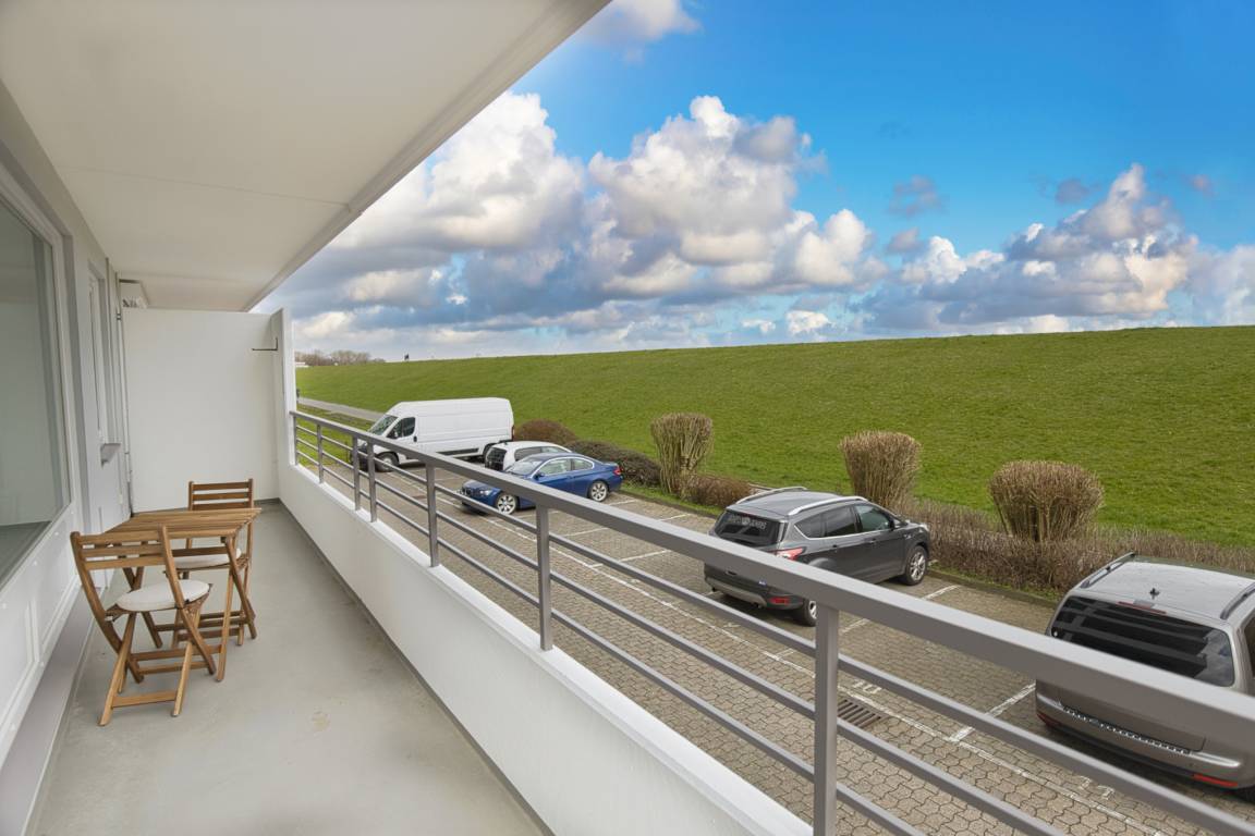 Die Ferienwohnung empfangt Sie in der Diele, großzügig mit Garderobe und dem Zugang zur Küche, zum Duschbad und zum Wohnbereich. Eine Waschmaschine, Kühlschrank mit Gefrierfach befinden sich direkt in der mit vielen Ablagen gut ausgestatteten Küche. Der Essbereich, der sich im Wohnzimmer befindet, bietet auch für ein Frühstücksbrunch genügend Platz am Tisch und wenn es das Wetter zulässt wird am Abend der Wein auf dem Balkon ausgeschenkt. Auch wenn Sie hier keine Seesicht genießen, die direkte Deichnähe lässt Sie entspannen. Wenige Schritte und Sie sind auf der der Deichkrone und haben das Wasser zum greifen nahe. Das Bojenbad in der Grimmershörnbucht ist nur wenige Meter entfernt.