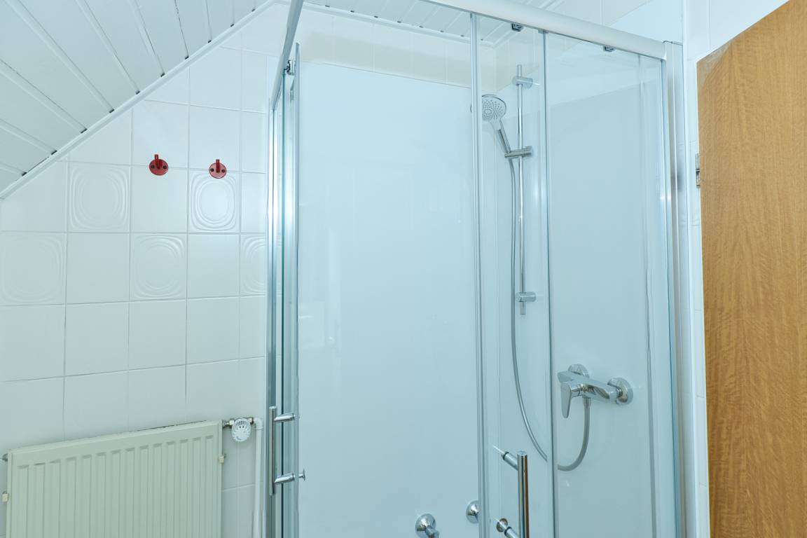 Das Schlafzimmer bietet ein Doppelbett (180×200 cm) und einen Kleiderschrank. Das Duschbad/WC mit Tageslicht ist innerhalb der Wohnung vorhanden.