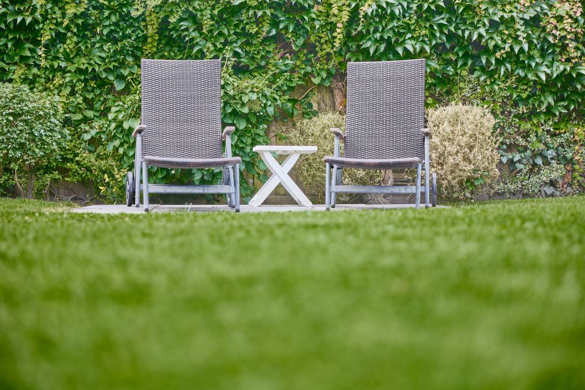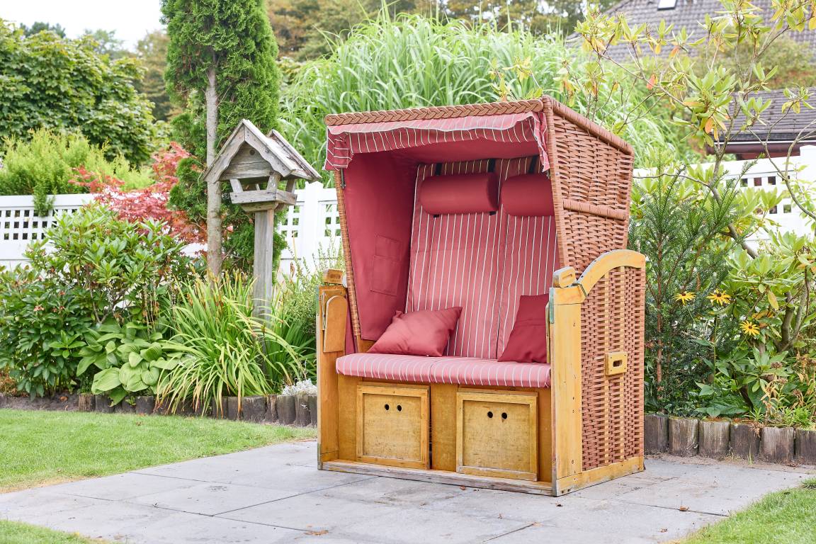 Großer Gemeinschaftsgarten mit Terrasse, Gartenmöbeln und Strandkörben