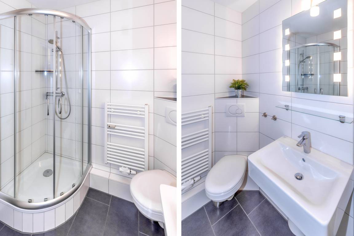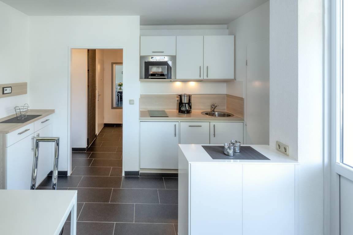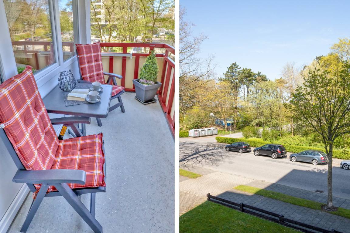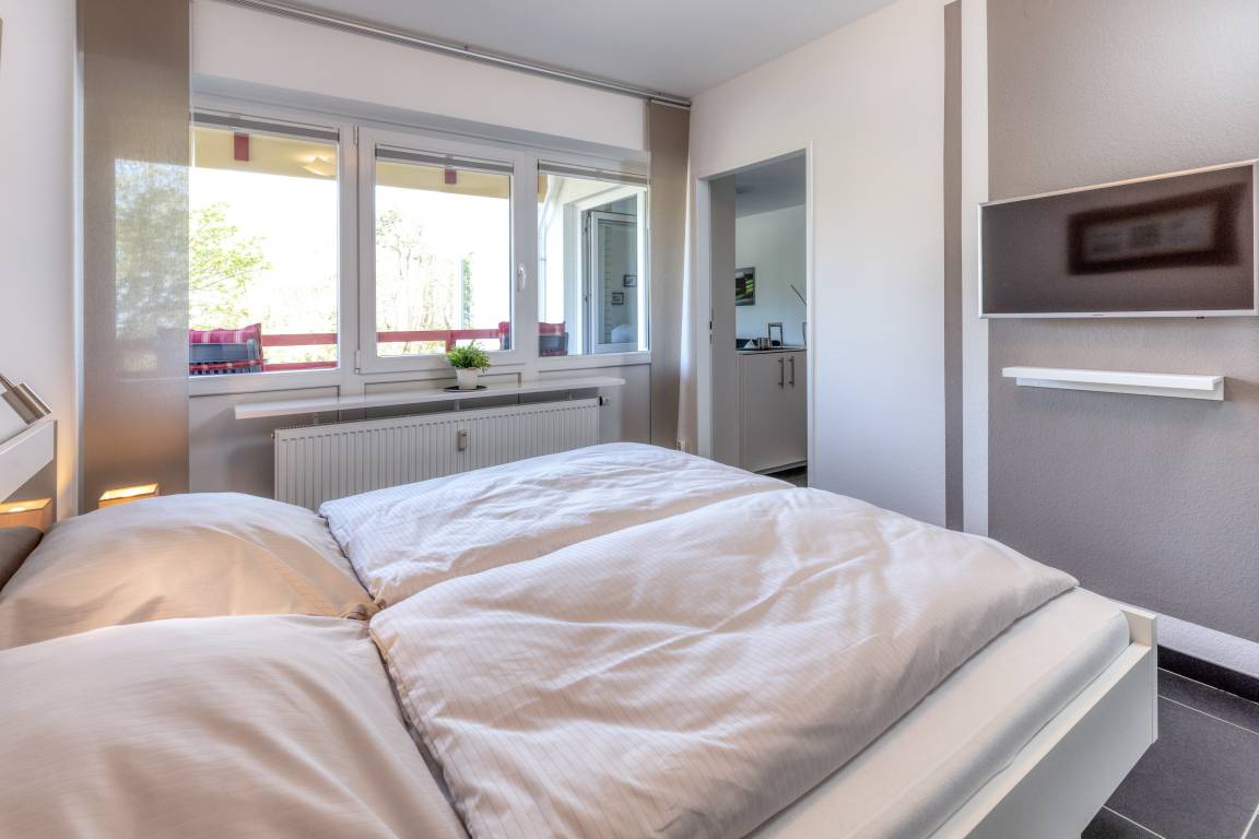 Das Appartement 20 ist ein 2-Raum-Appartement im 2. Obergeschoss für bis zu 3 Personen mit 39 qm. Der möblierte Westbalkon bietet morgens Schatten und nachmittags Sonne.